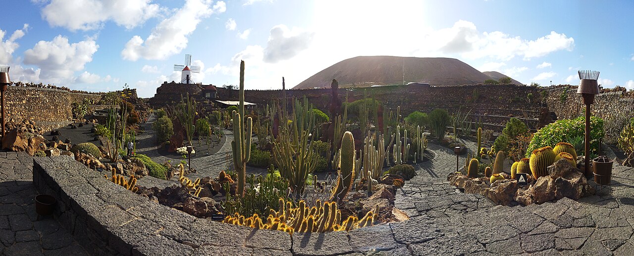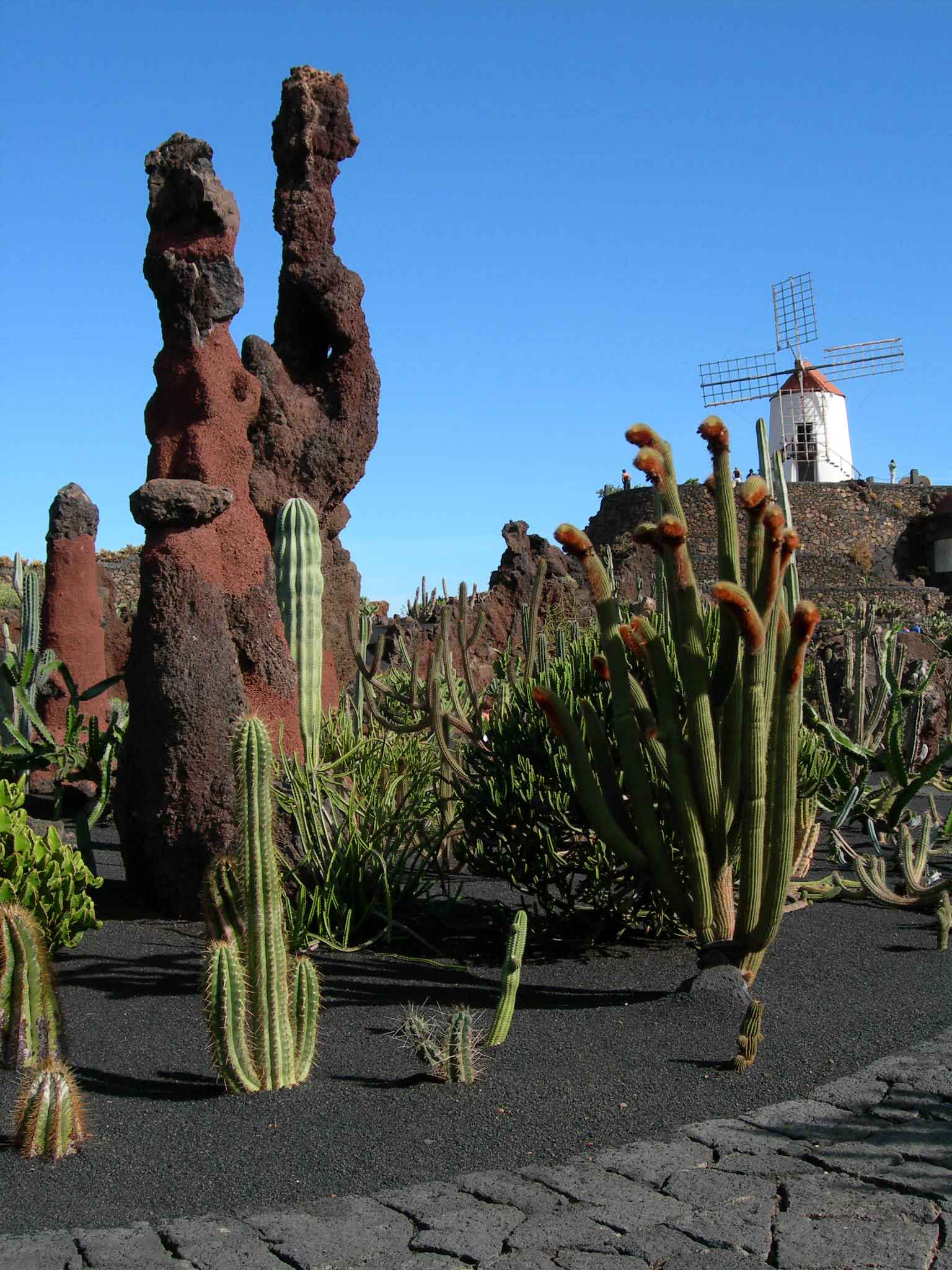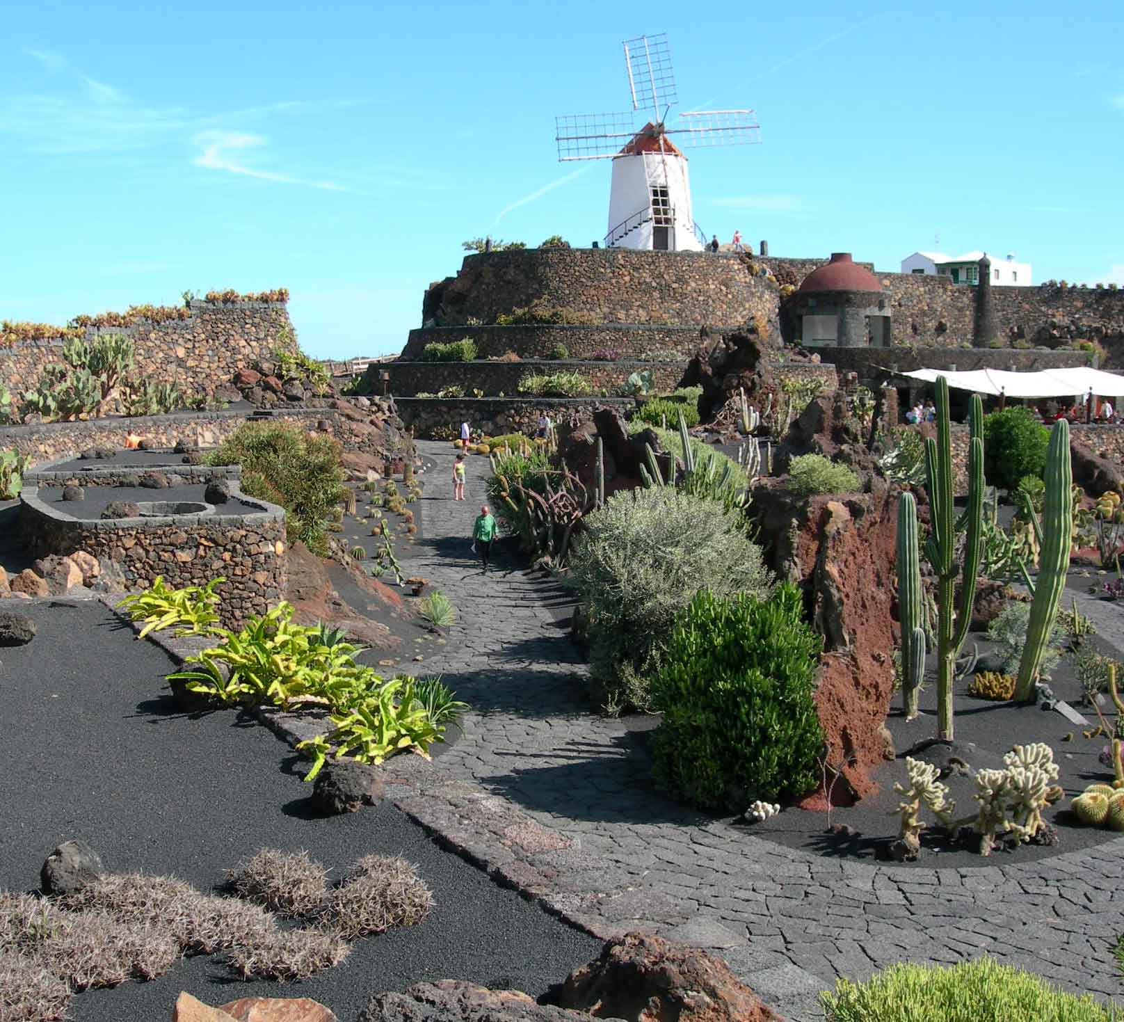 A parte de las más de 1.400 especies de cactus presentes en el jardín, se conserva uno de los característicos molinos de viento donde se elaboraba el gofio, un alimento extraído del millo y otros cereales y, que es un excelente mirador sobre el jardín.