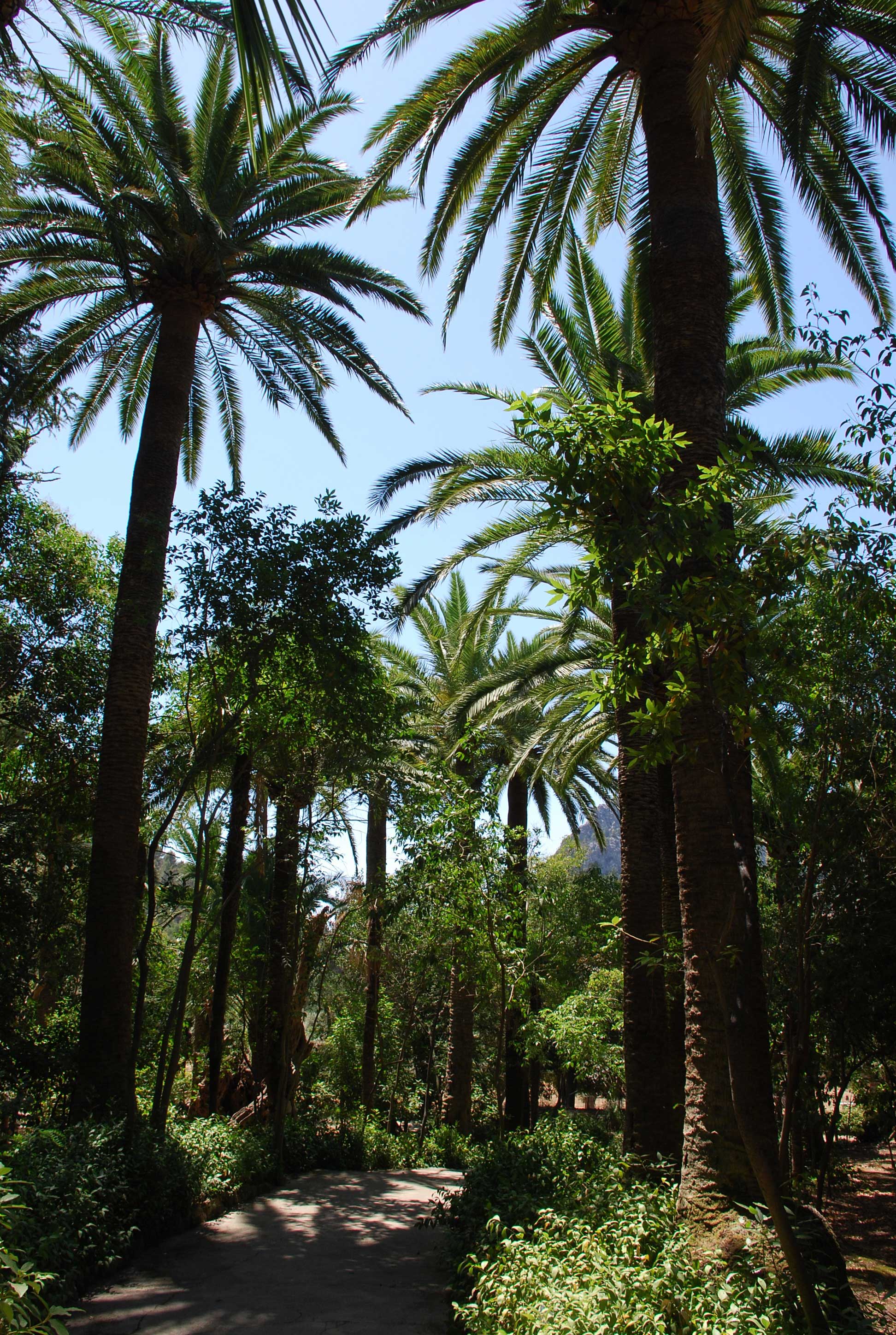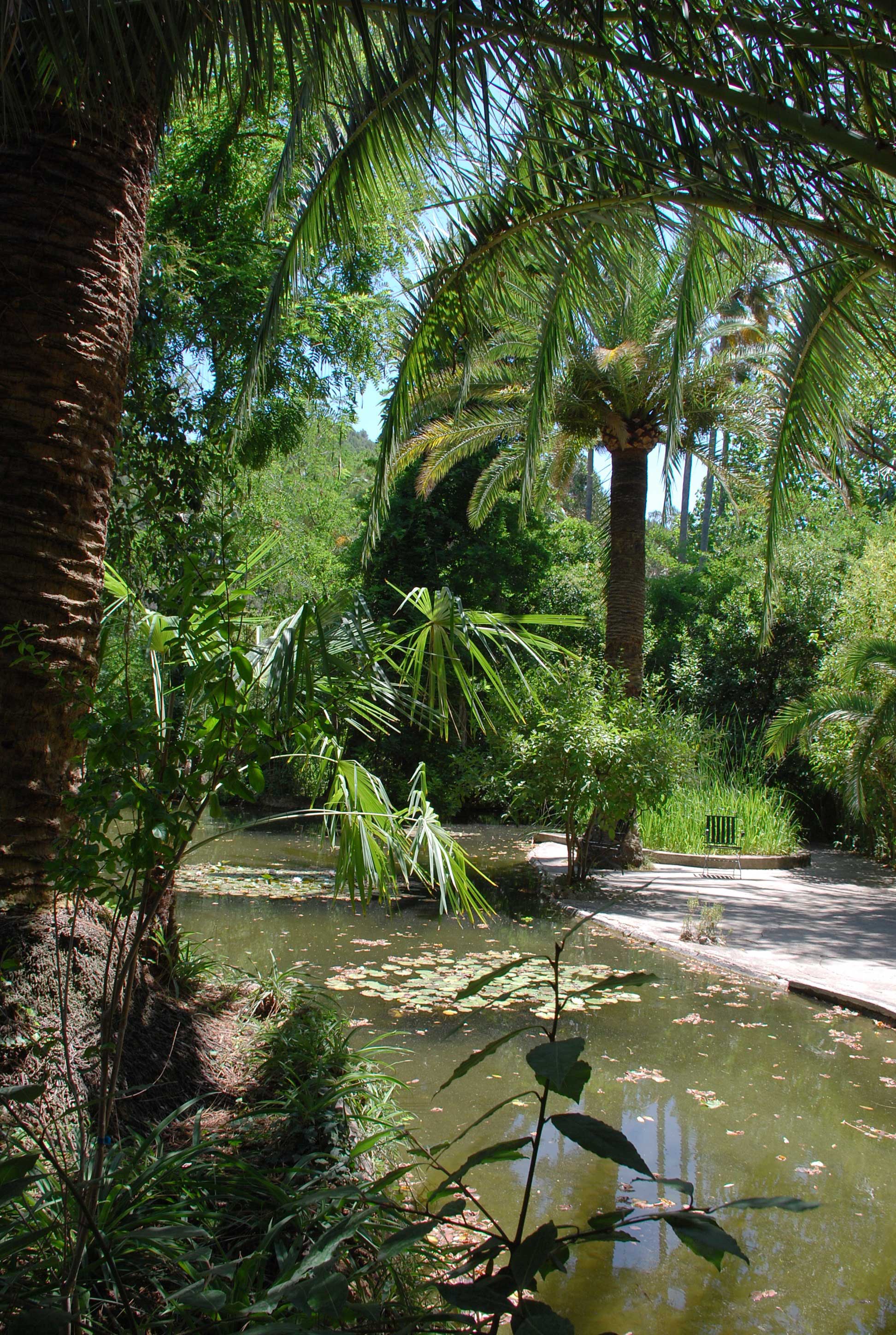 Aquí, en un jardín marcado por la geometría de los parterres, podemos encontrar pequeñas fuentes, un estanque con nenúfares y gran variedad de palmeras surgiendo entre las copas de los árboles.