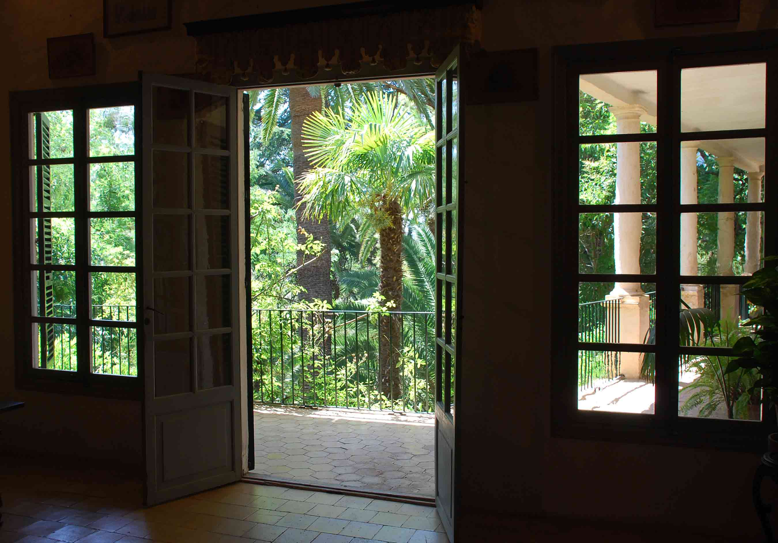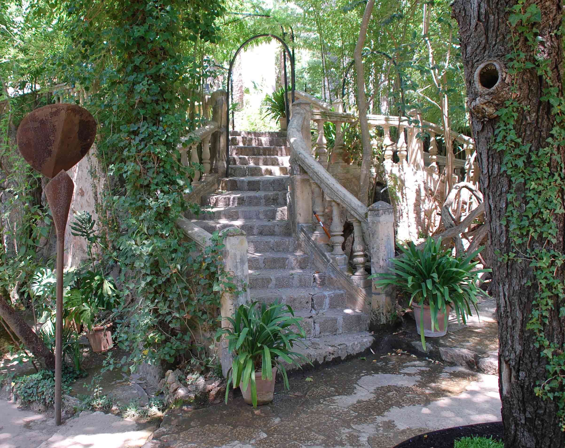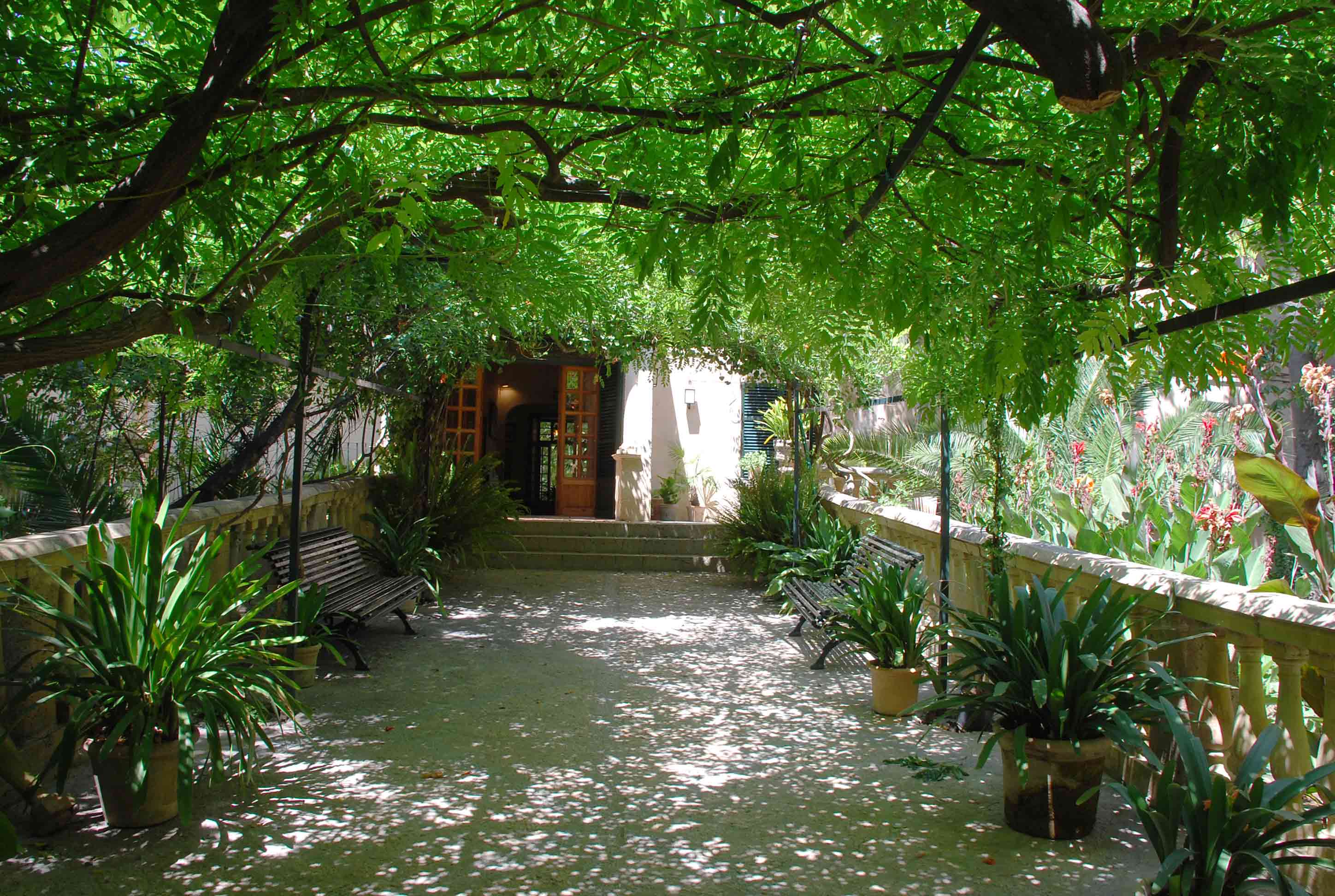 El conjunto de grandes árboles y pergolas emparradas que sombrean el jardín domina el espacio a modo de oasis, en marcado contraste con el paisaje mediterráneo, mucho más seco de los alrededores.