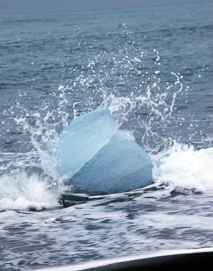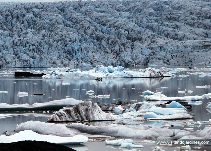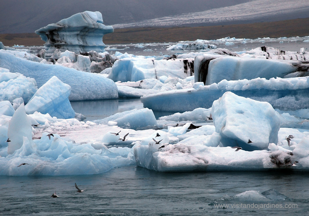 Poco a poco, los bloques desprendidos del glaciar son arrastrados hacia el mar por la corriente, convirtiéndose en pequeños icebergs, que regresan a la playa donde se derriten lentamente.