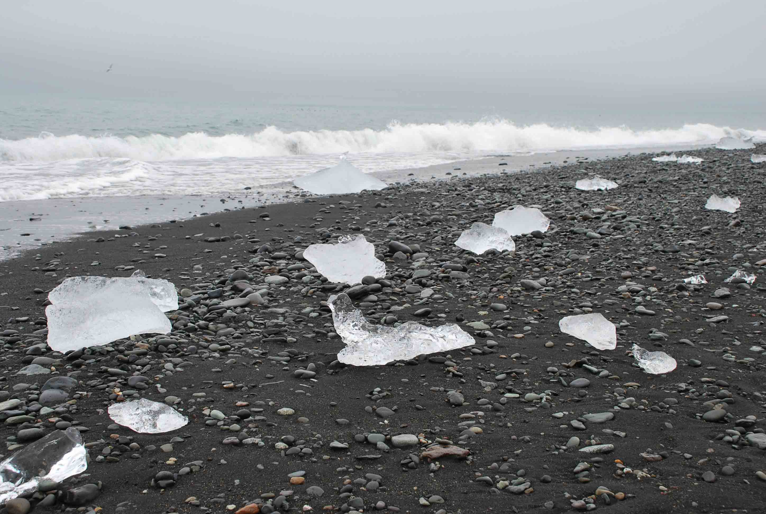 Sobre la oscuridad de la arena, los bloques de hielo desprendidos del glaciar que las olas van devolviendo a la playa, resaltan brillando como diamantes.