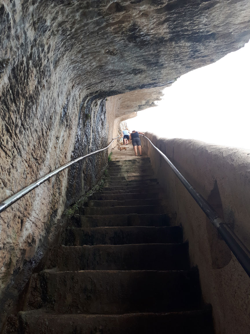 Se trata de una escalera excavada en la roca del acantilado a 45 grados, que desciende al mar y está formada por 187 peldaños, directamente esculpidos sobre la roca blanca.