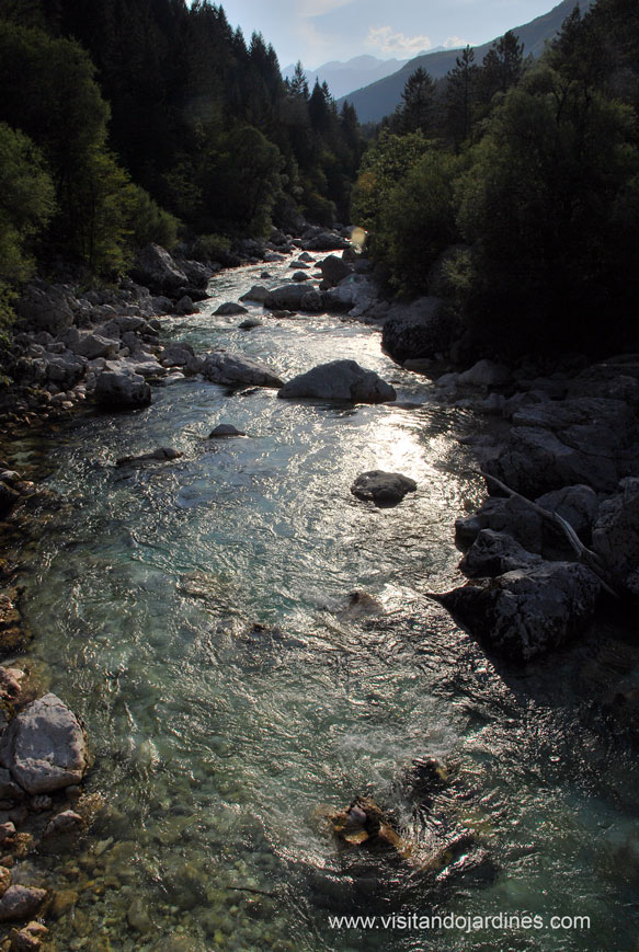 El espectacular río Soča nace en el Parque Nacional de Triglav, en los Alpes Julianos, en medio de uno de los paisajes más bonitos de Eslovenia, desciende por un frondoso valle y se dirige hacia Italia, donde se denomina Isonzo, para desembocar en el Mar Adriático.