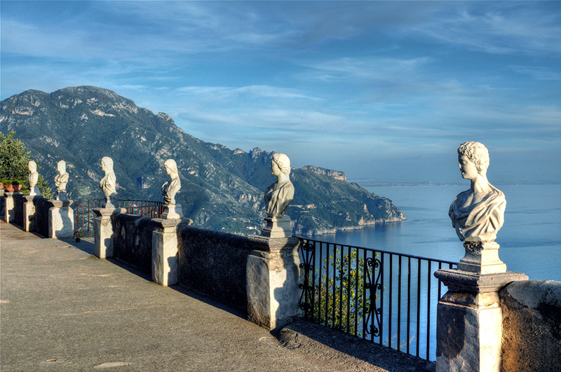 Del conjunto, destaca especialmente el espectacular mirador de la Terrazza dell’Infinito. La terraza está presidida por una serie de bustos, situados sobre una balaustrada suspendida 300 metros por encima del mar.