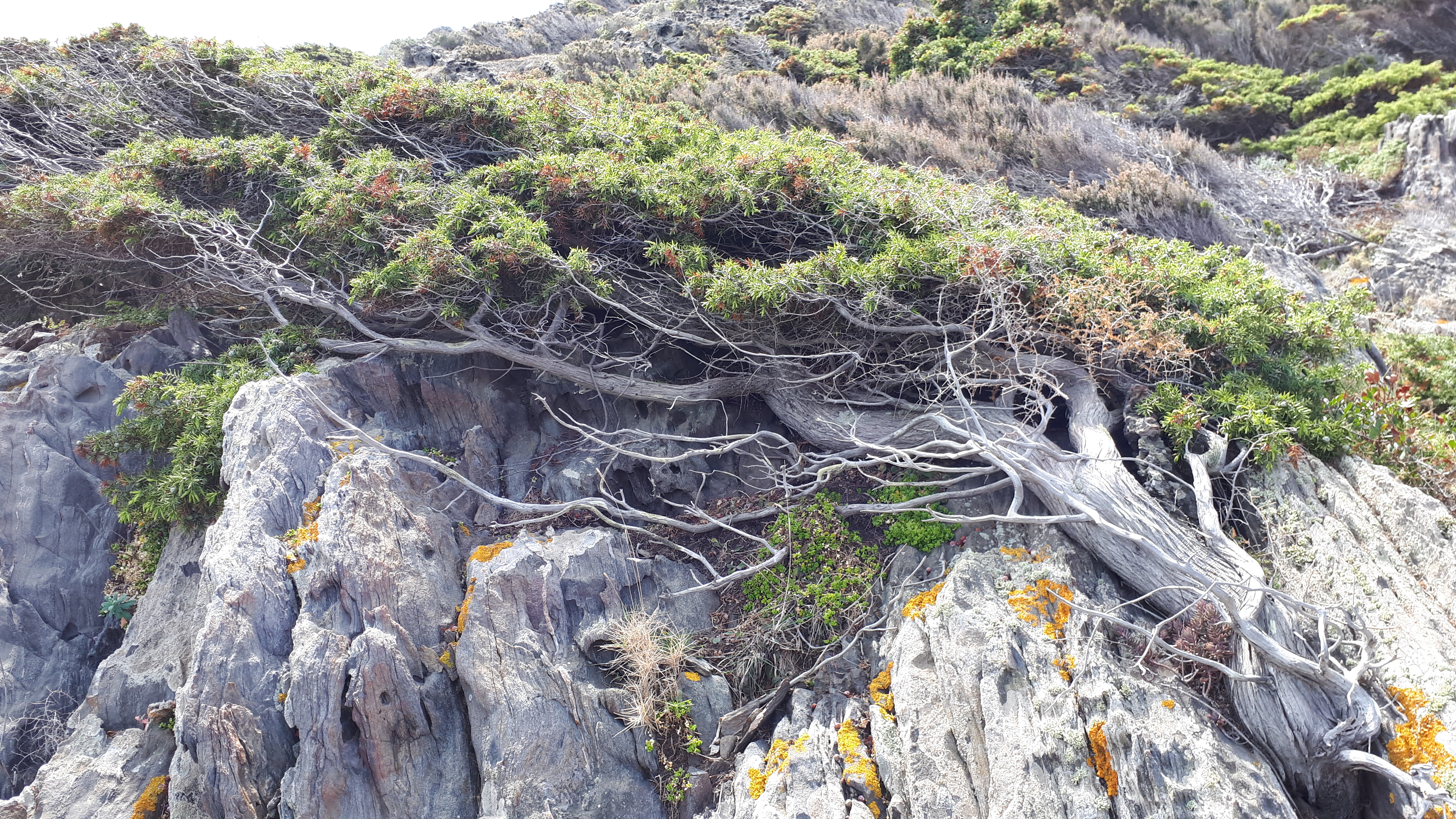 Gracias a la extracción de flora exótica e invasora que se había apoderado del paisaje y la restitución de las dinámicas ambientales, hoy la vegetación autóctona vuelve a colonizar con firmeza las grietas de las rocas, creciendo a ras de suelo para tratar de adaptarse a la tramuntana.