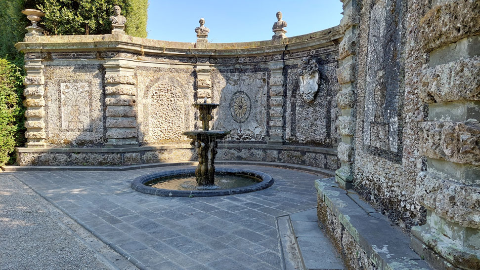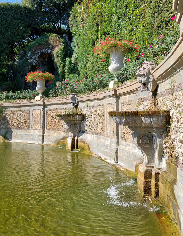El majestuoso teatro de agua forma parte de la arquitectura del siglo XVII y se encuentra frente a la fachada posterior de la Villa marcando el inicio del eje central.