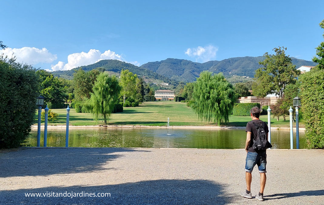 Al final de este gran eje central, en el punto más bajo del jardín, un gran estanque con un pequeño embarcadero, recoge las aguas de las fuentes y arroyos de todo el complejo, formando una lámina de agua desde donde se obtiene una bonita vista de la Villa.