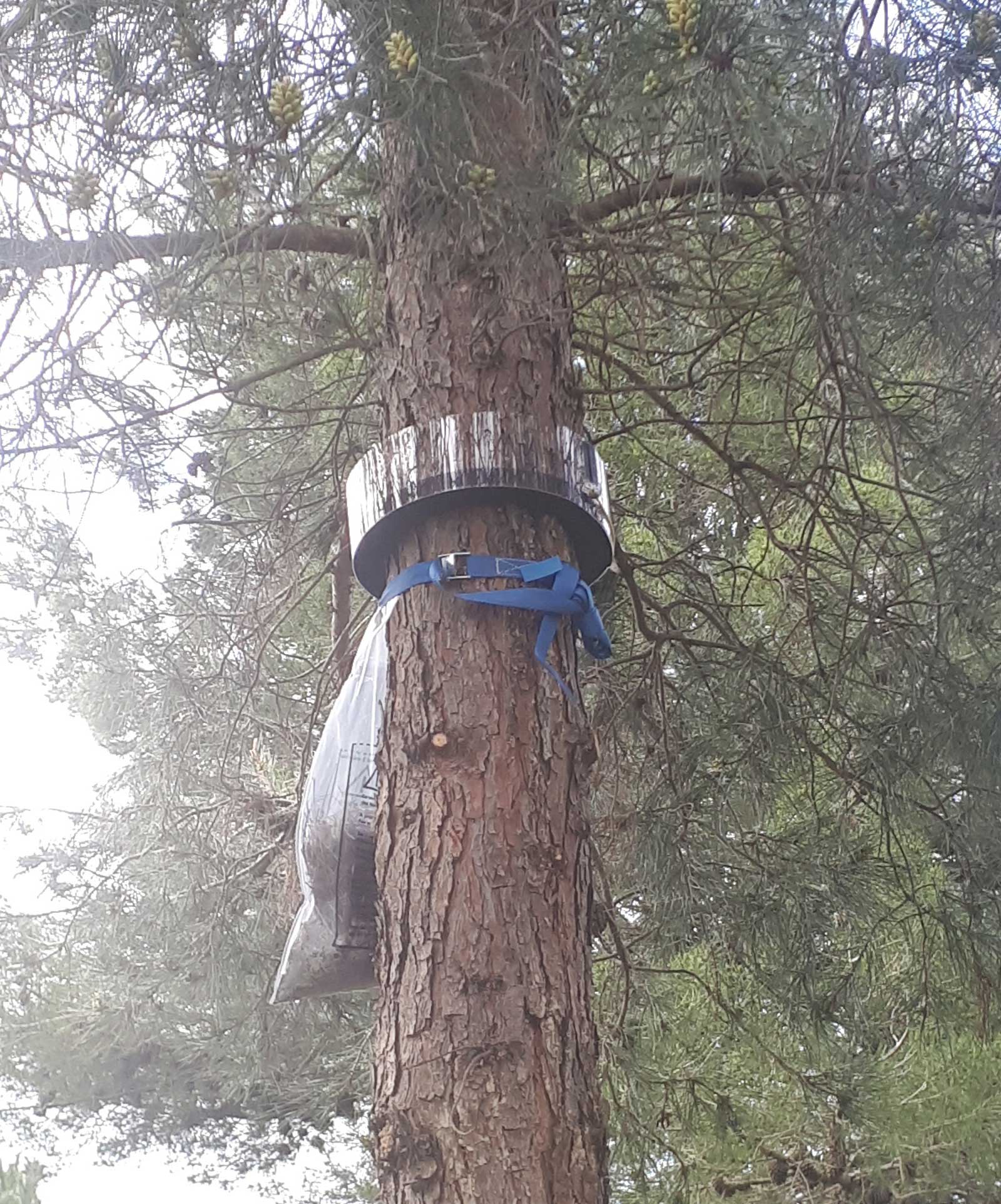 - Instalación de trampas físicas, como anillos en el tronco que capturen las orugas cuando desciendan para evitar que lleguen al suelo en ejemplares grandes o aislados.