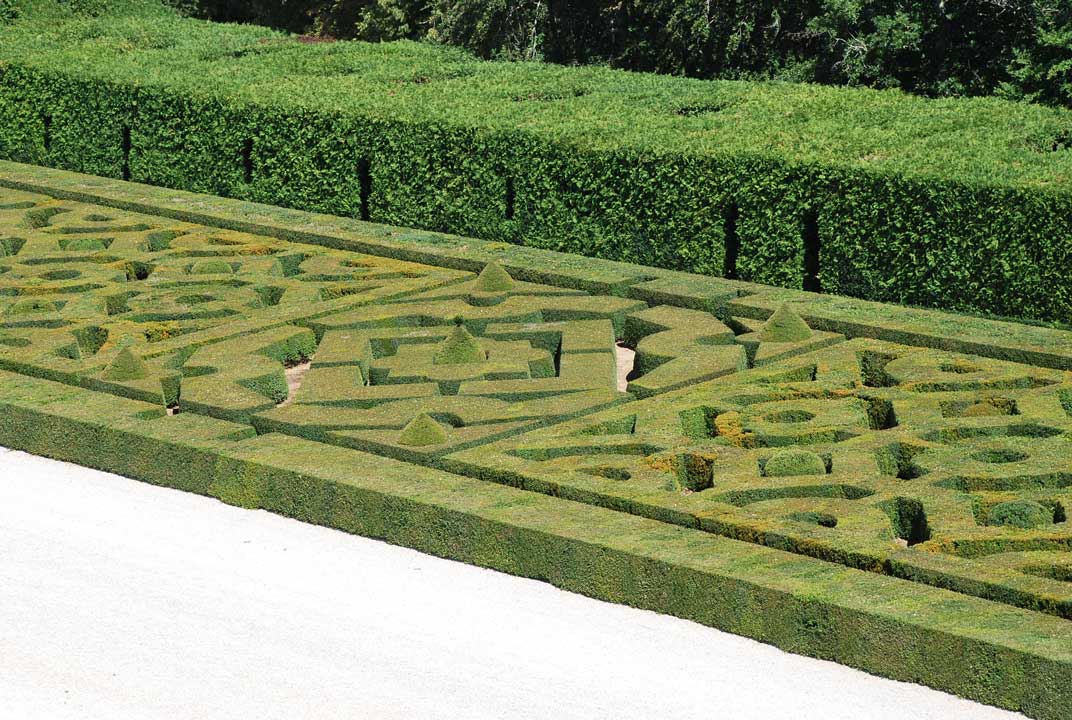 Especialmente remarcable es el diseño de la terraza principal, cuyos parterres y arabescos pueden observarse desde las distintas estancias del castillo.