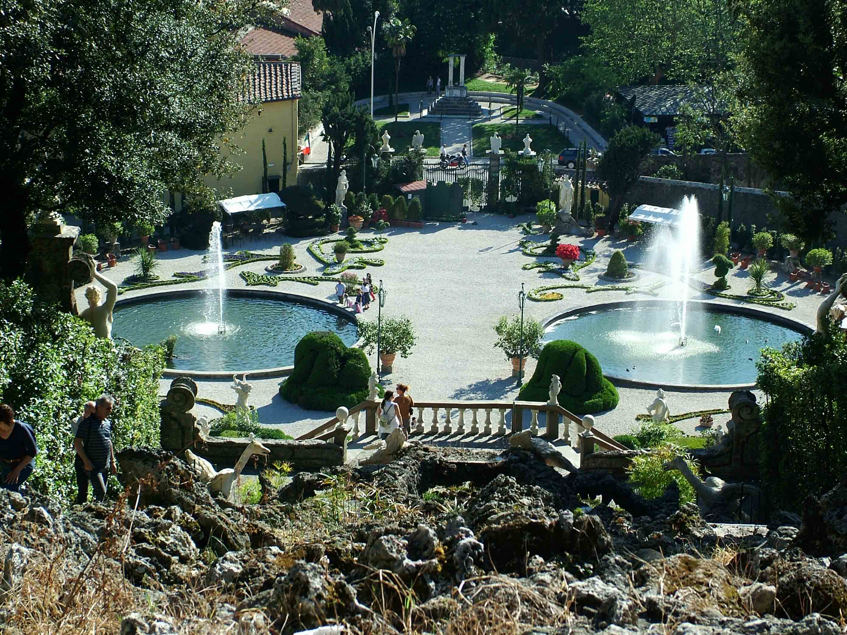 Un jardín acuático con distintos juegos de agua fue construido al pie de una serie de terrazas con balaustradas y grandes escaleras simétricas, que conectan los jardines de la base de la colina con la casa, la cascada, el teatro di verdura y la parte superior de los jardines.
