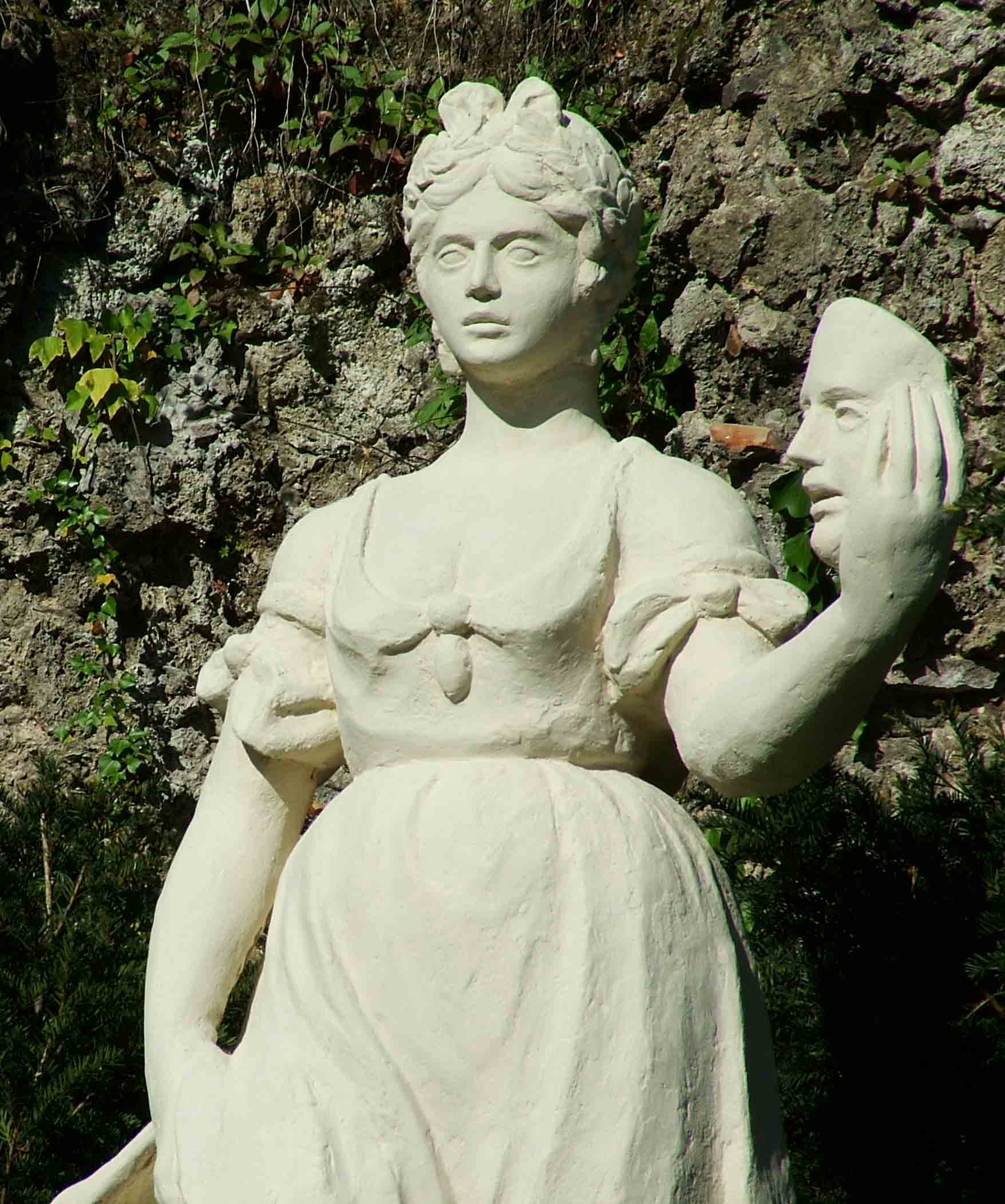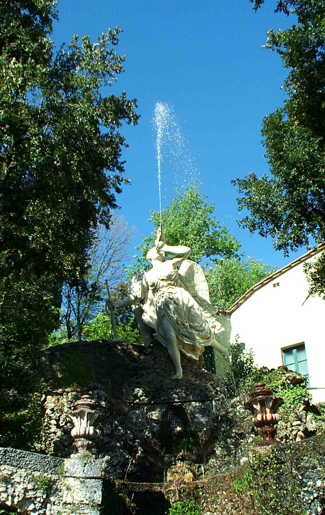 En las terrazas superiores, una larga cascada termina con una estatua de la Fama que sopla en una caracola de la que sale un potente chorro, simbolizando el origen del agua en el jardín.