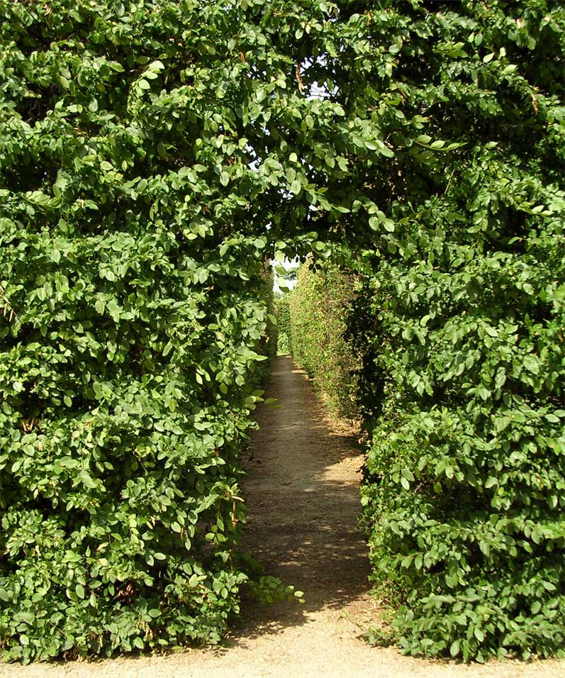 En ambos costados, separando el jardín formal de los bosques que lo rodean, dos grandes setos forman túneles vegetales, enmarcan y enfatizan los parterres y ofrecen zonas de sombra para los meses más calurosos.
