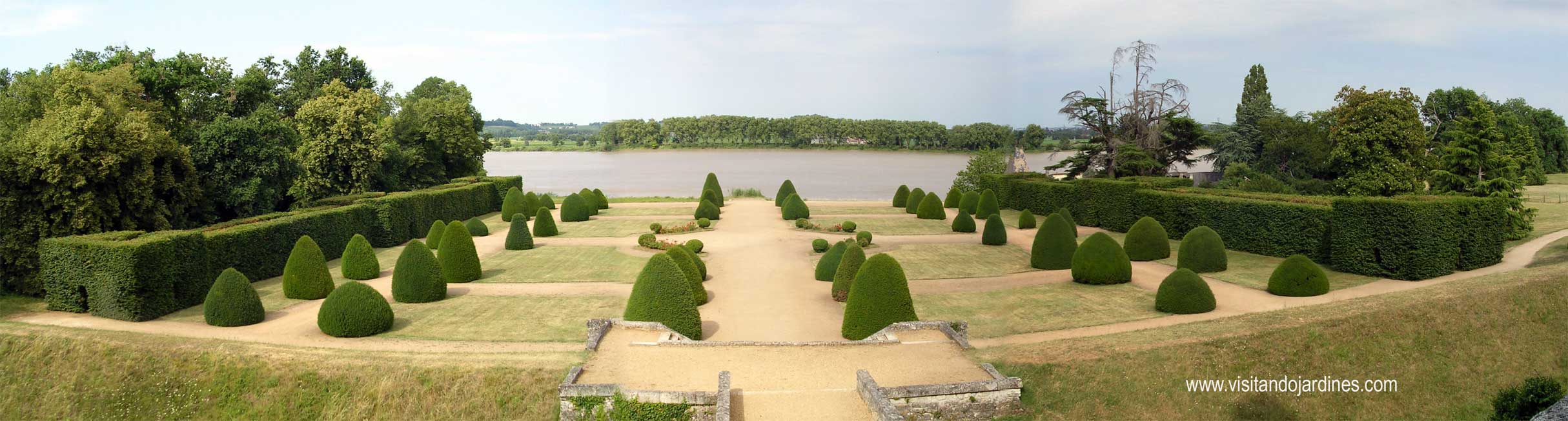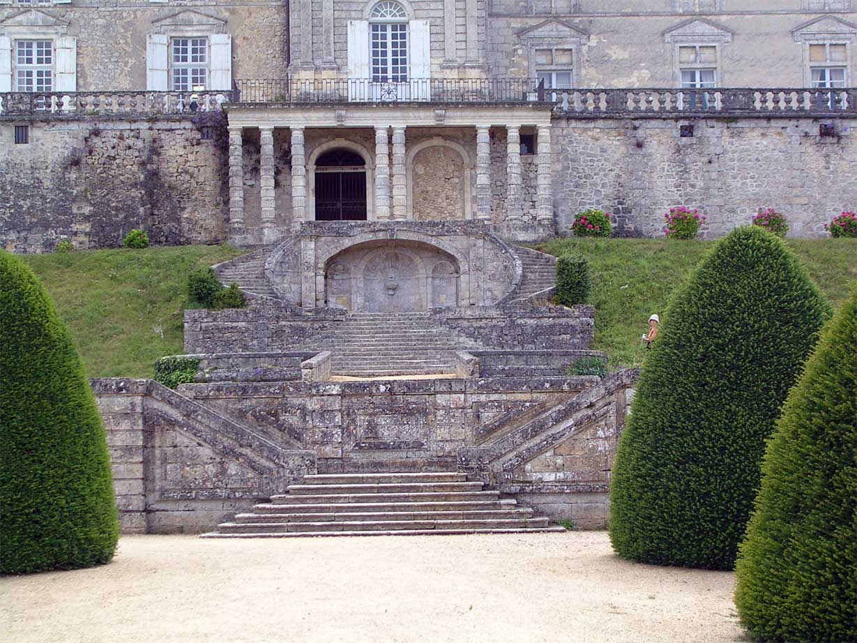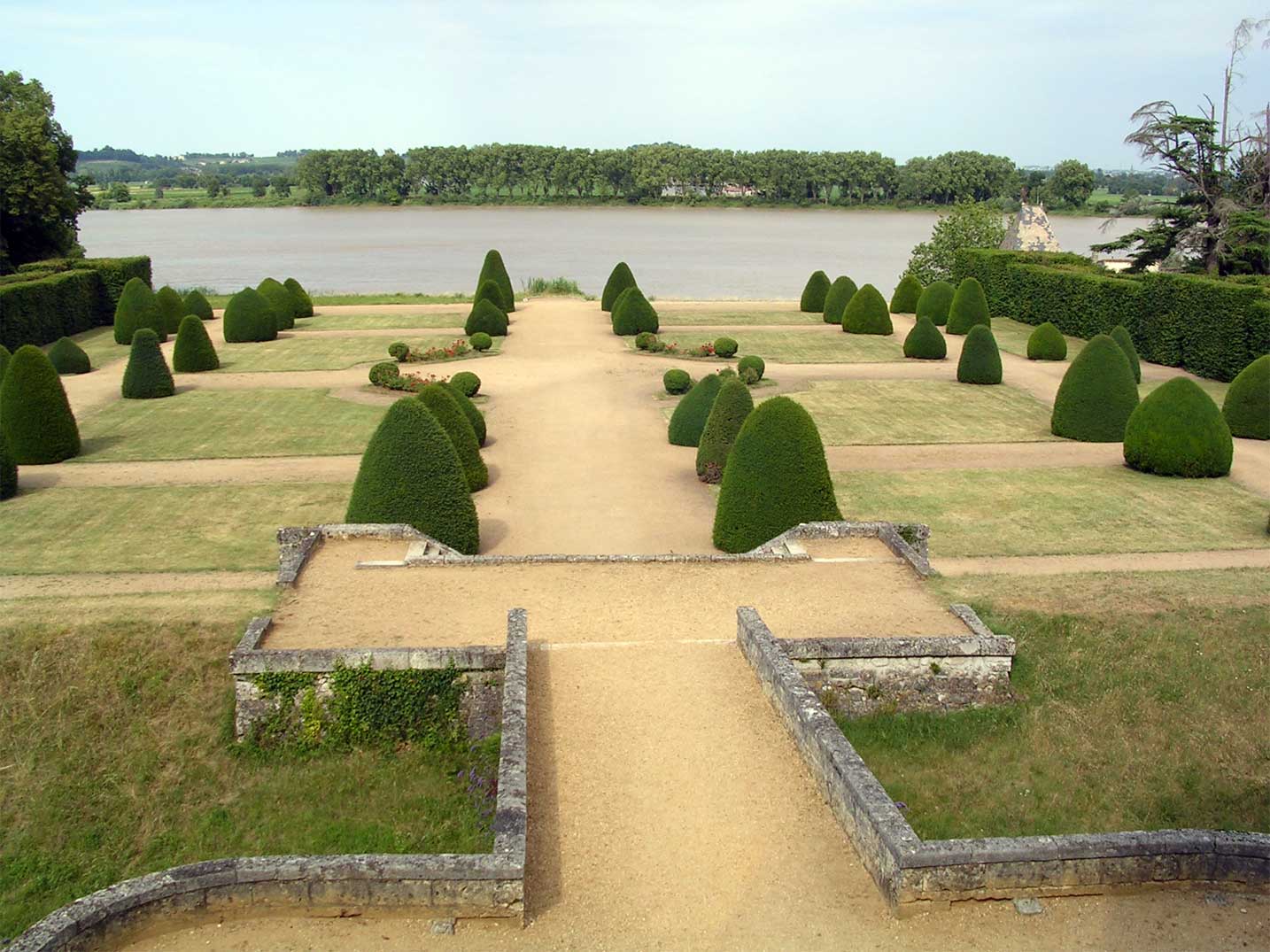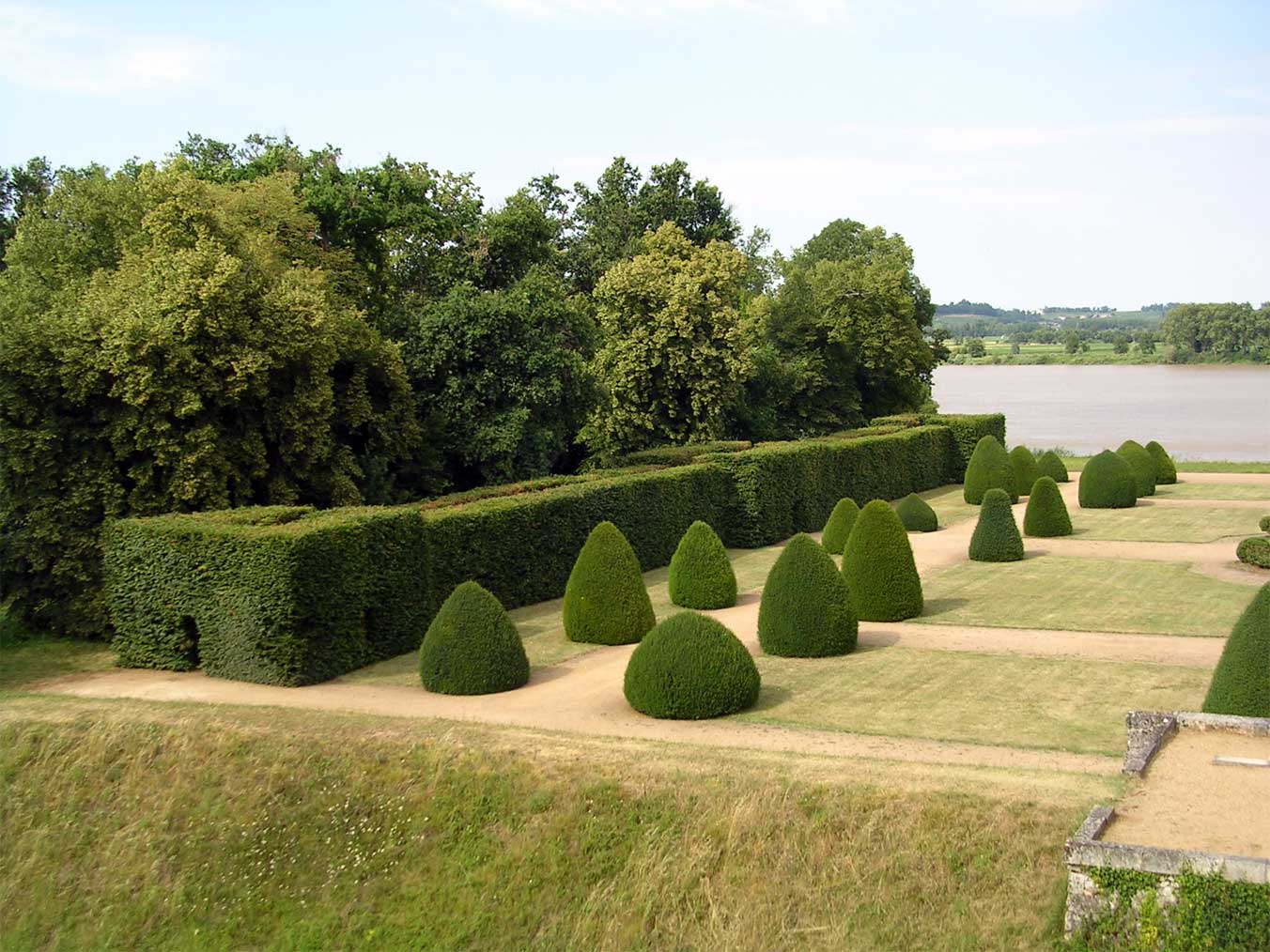 Los parterres, que se extienden bajo los escalones que conducen al castillo, se encuentran salpicados de tejos recortados en bolas, conos y pirámides, cuyas alturas variables marcan un ritmo creciente o decreciente, aportando dinamismo al espacio.