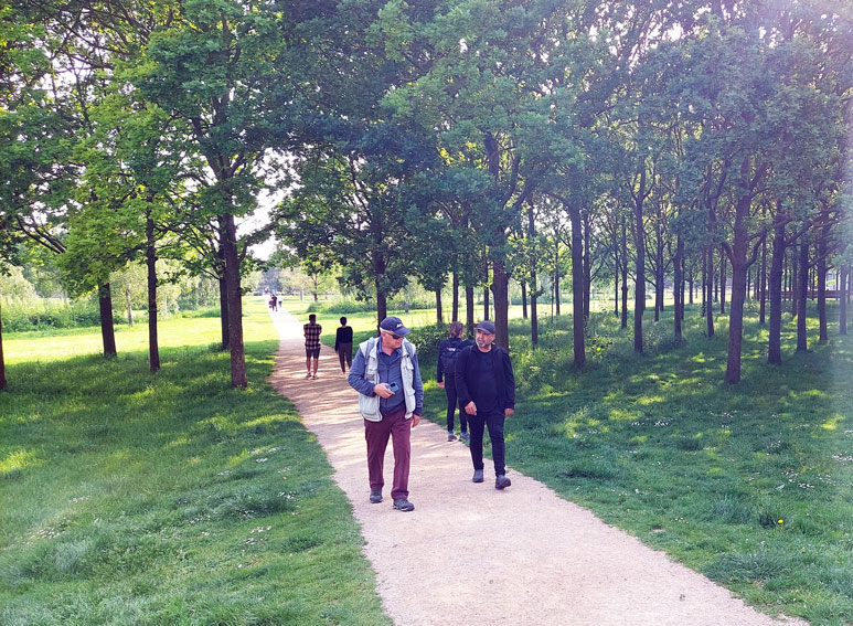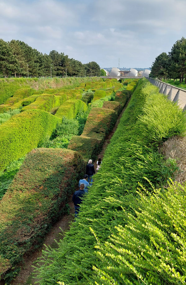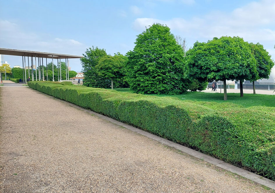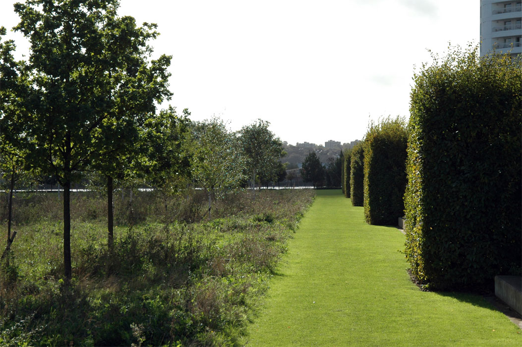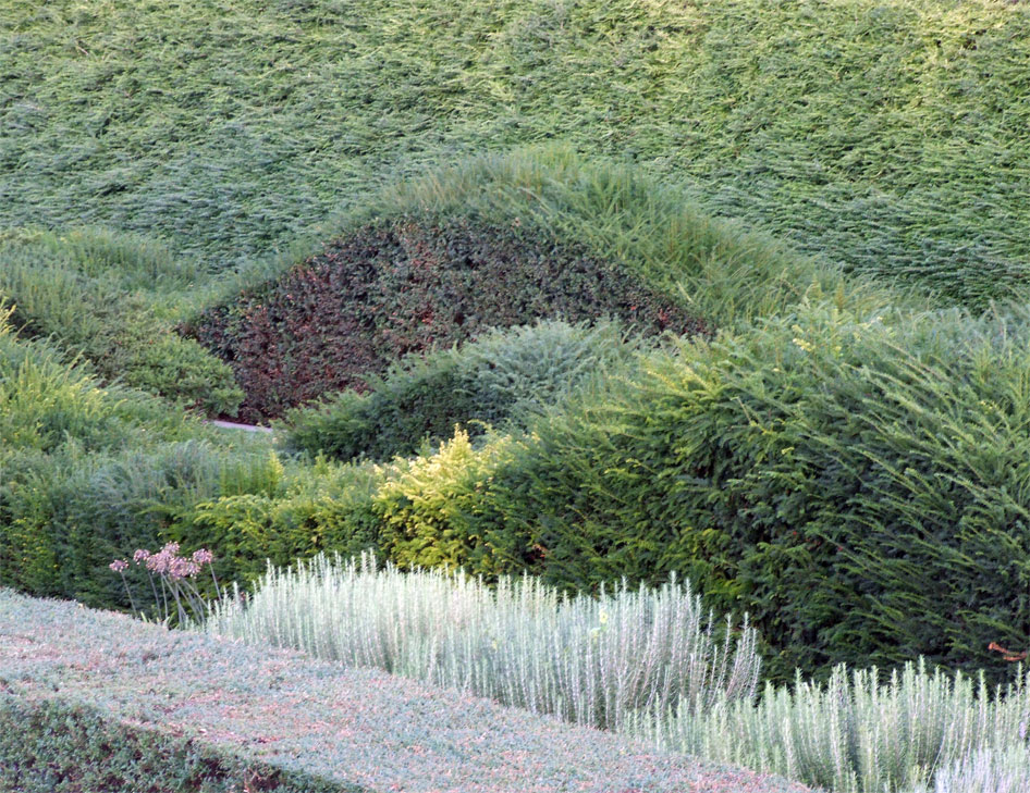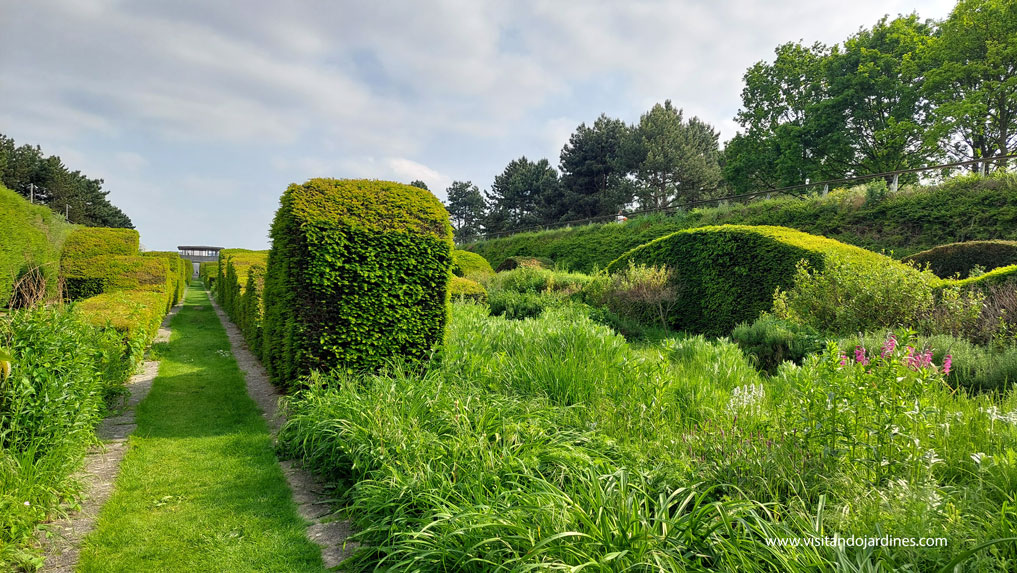 Grandes bloques de tejo (Taxus baccata) están recortados en formas onduladas muy escultóricas, generando un suave movimiento rítmico que, poco a poco, nos conducen al extremo del dique verde, donde se encuentran el río y las barreras.
