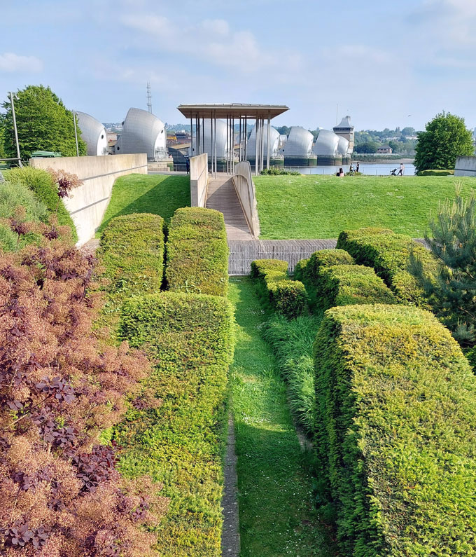 El Parque de las Barreras del Támesis se encuentra aguas abajo de Londres, junto a unas enormes compuertas que fueron construidas para evitar las inundaciones que sufría la capital, cuando coincidían grandes tormentas con la pleamar.