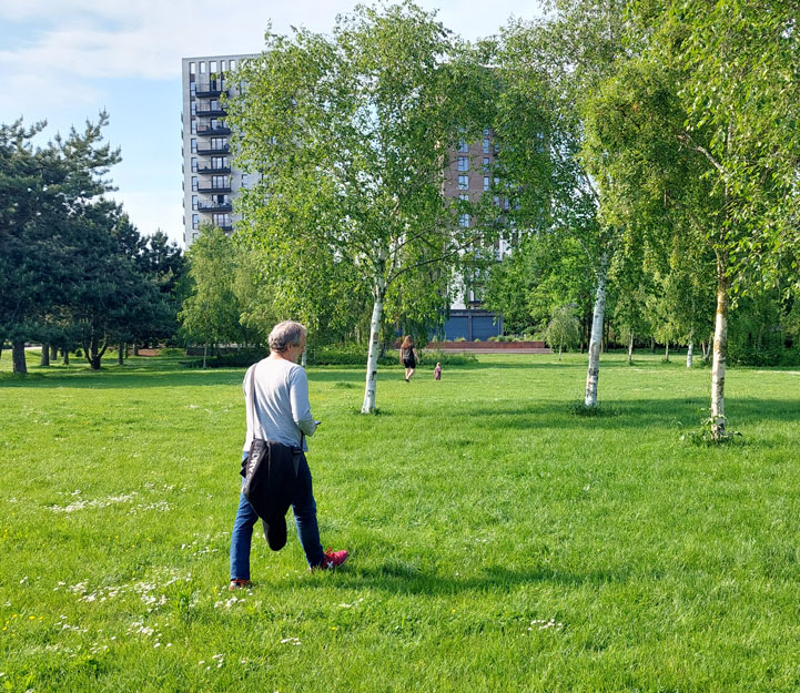 Se trata de una gran explanada que se siega habitualmente de manera diferenciada, donde se juega con los volúmenes y las líneal visuales que generan las plantaciones y que queda cortada por una gran hendidura.
