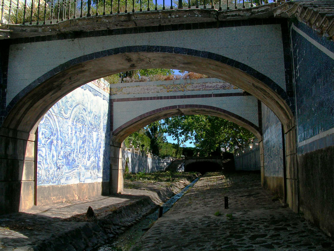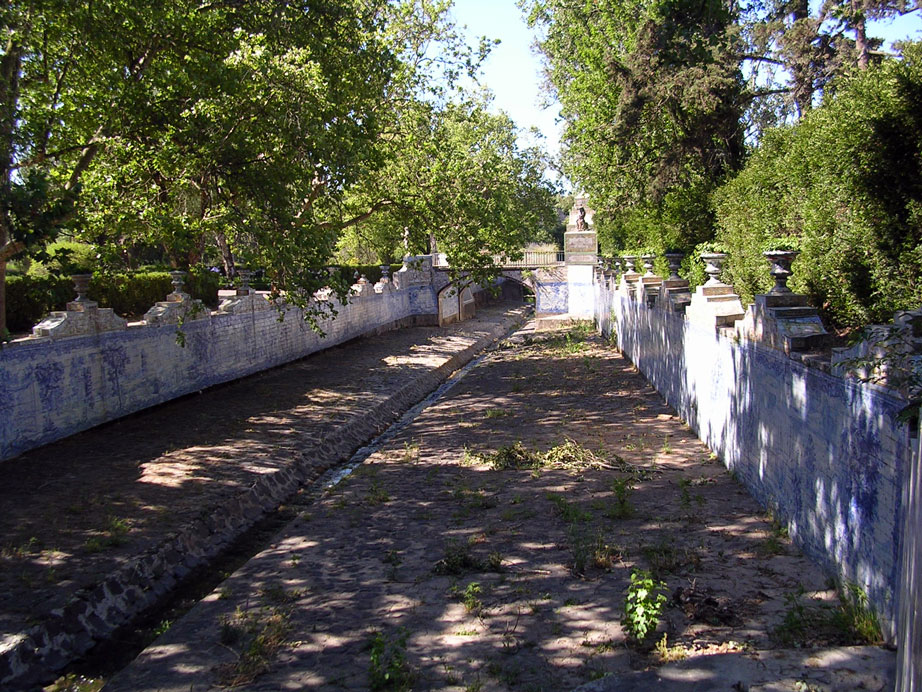 Al final del parque, encontramos uno de los elementos más destacados del jardín: el gran Canal de Azulejos que, con sus 115 metros, formaba un gran estanque de agua controlado por compuertas, totalmente revestido interior y exteriormente por paneles de azulejos azules y blancos.