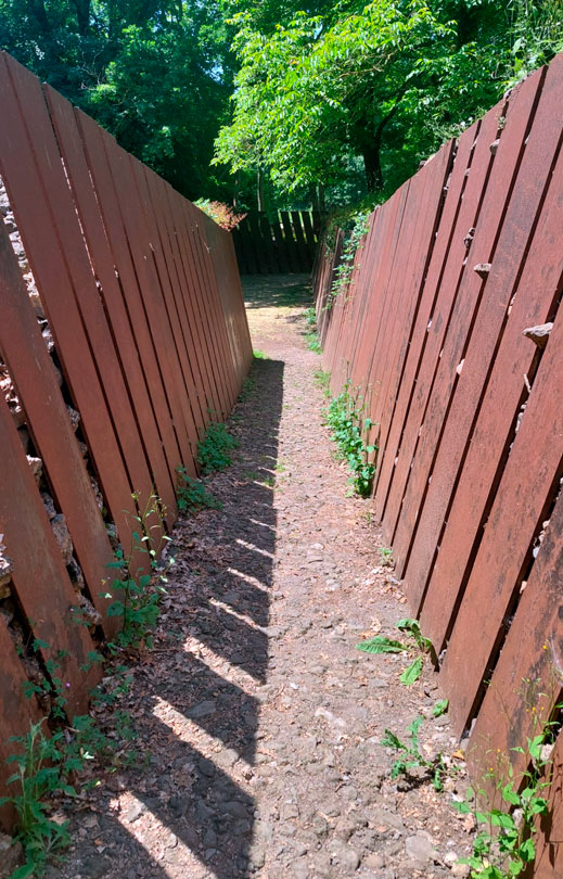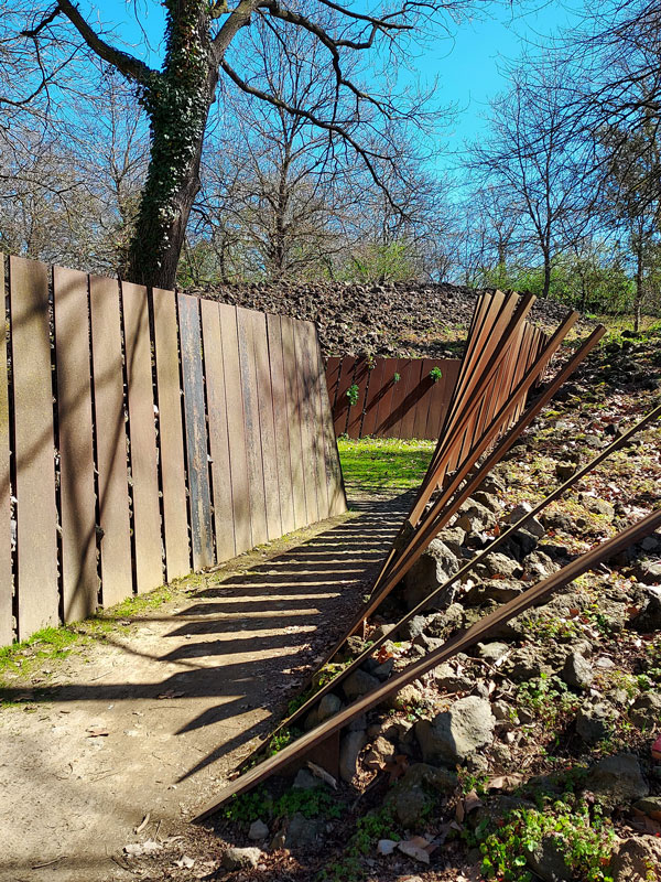 Se trata de un salón de acceso, formado por lamas de acero corten, que contienen tras ellas montones inmensos de rocas volcánicas.
