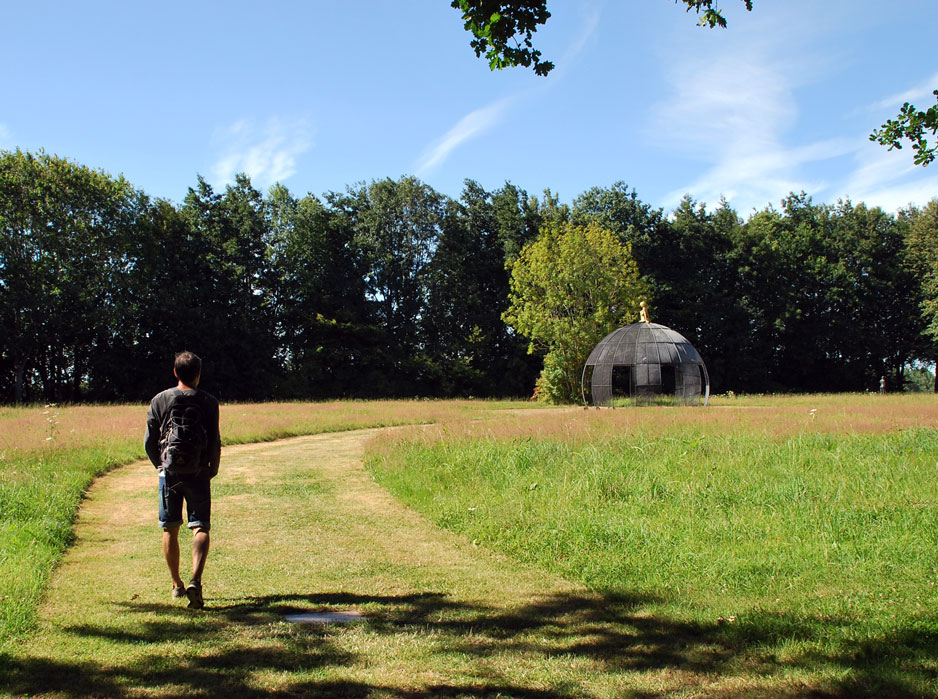 Tras los arboles, en el centro de la pradera, aparece poderosa una escultura dedicada a Gaia y el espacio solar, cuyo magnetismo reclama nuestra atención. En todo momento, percibimos la armonía entre arte y naturaleza.