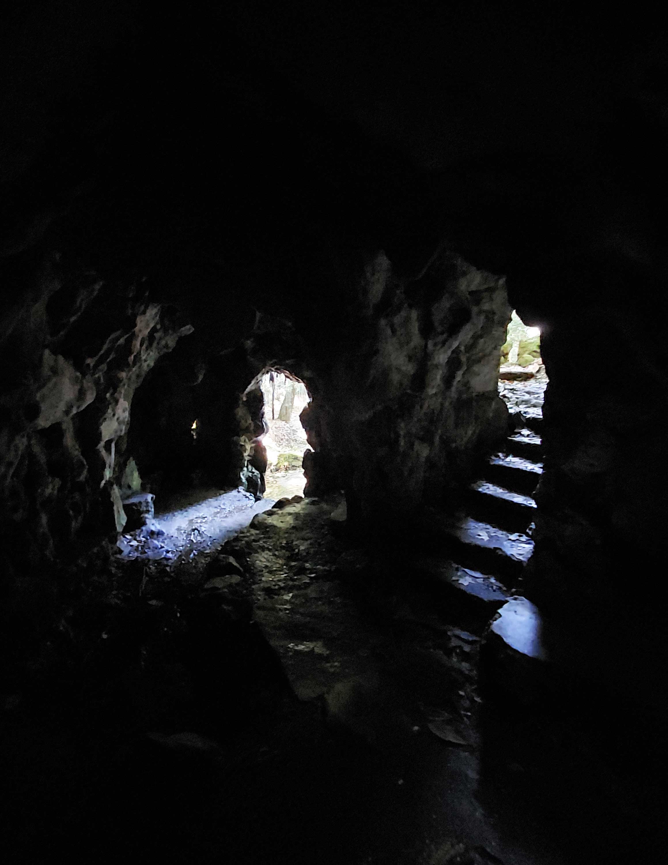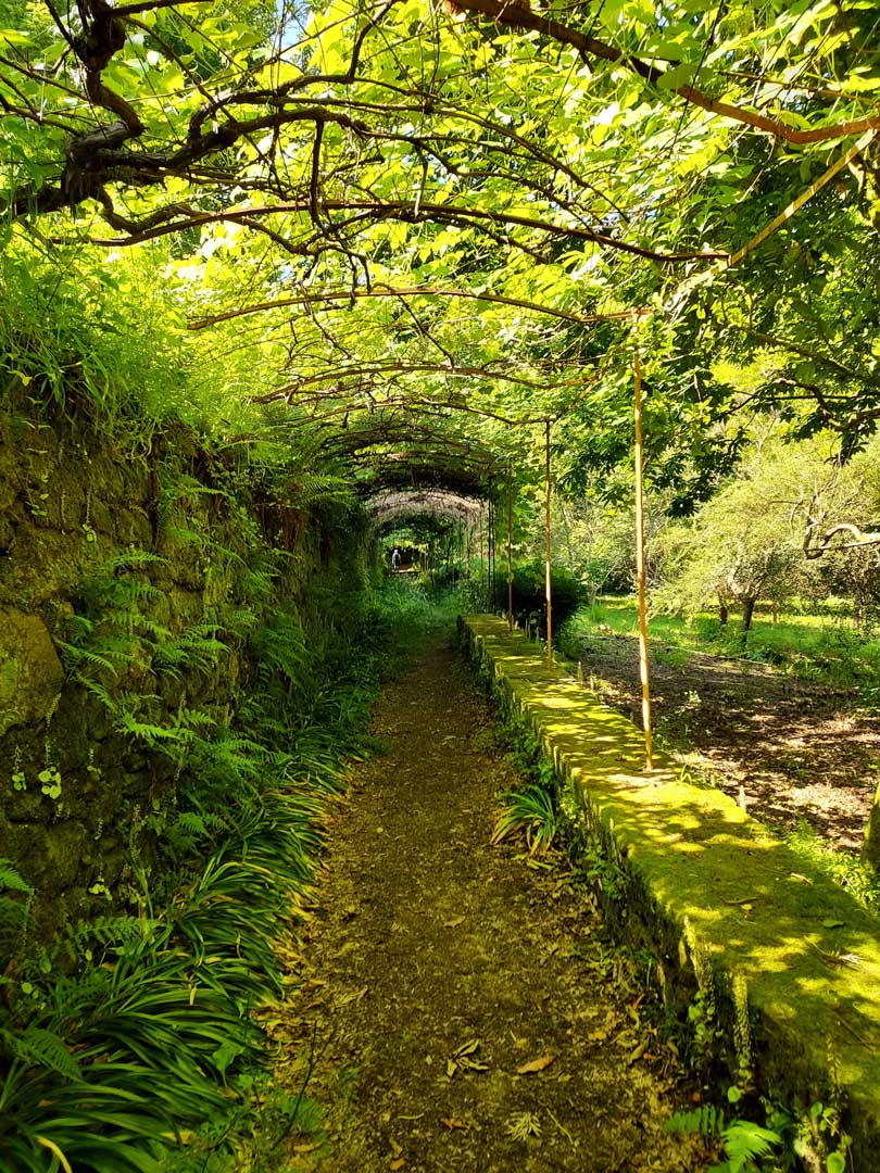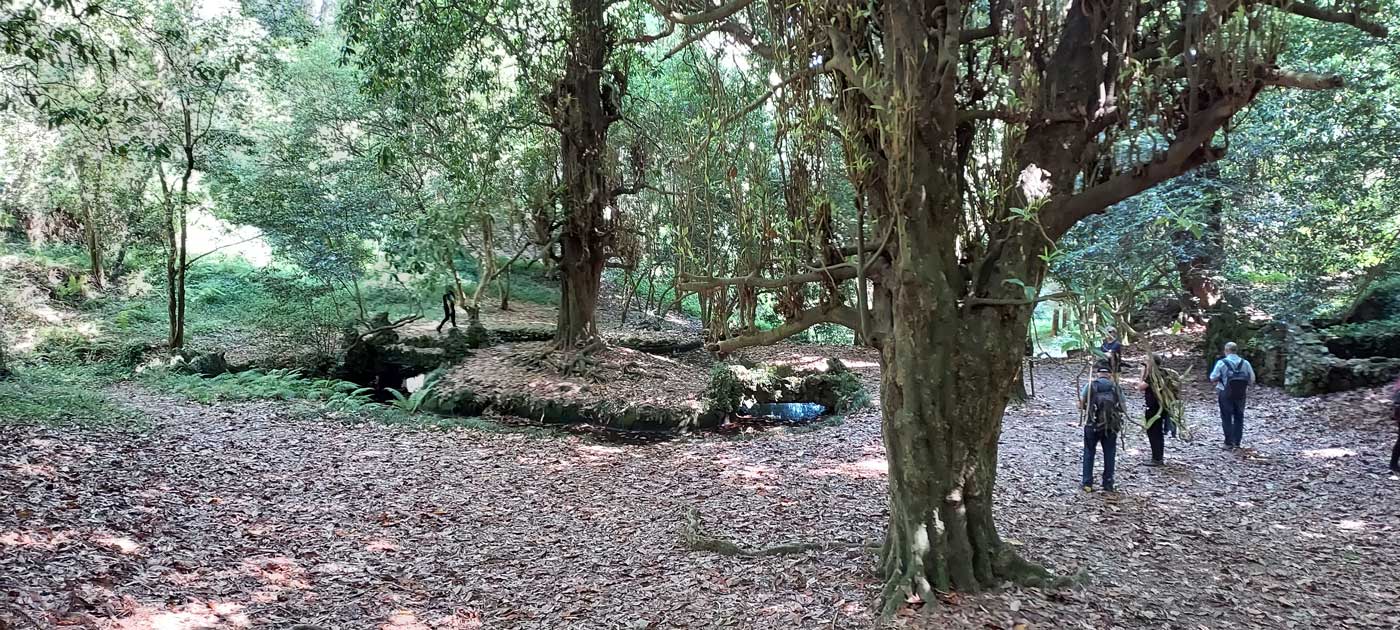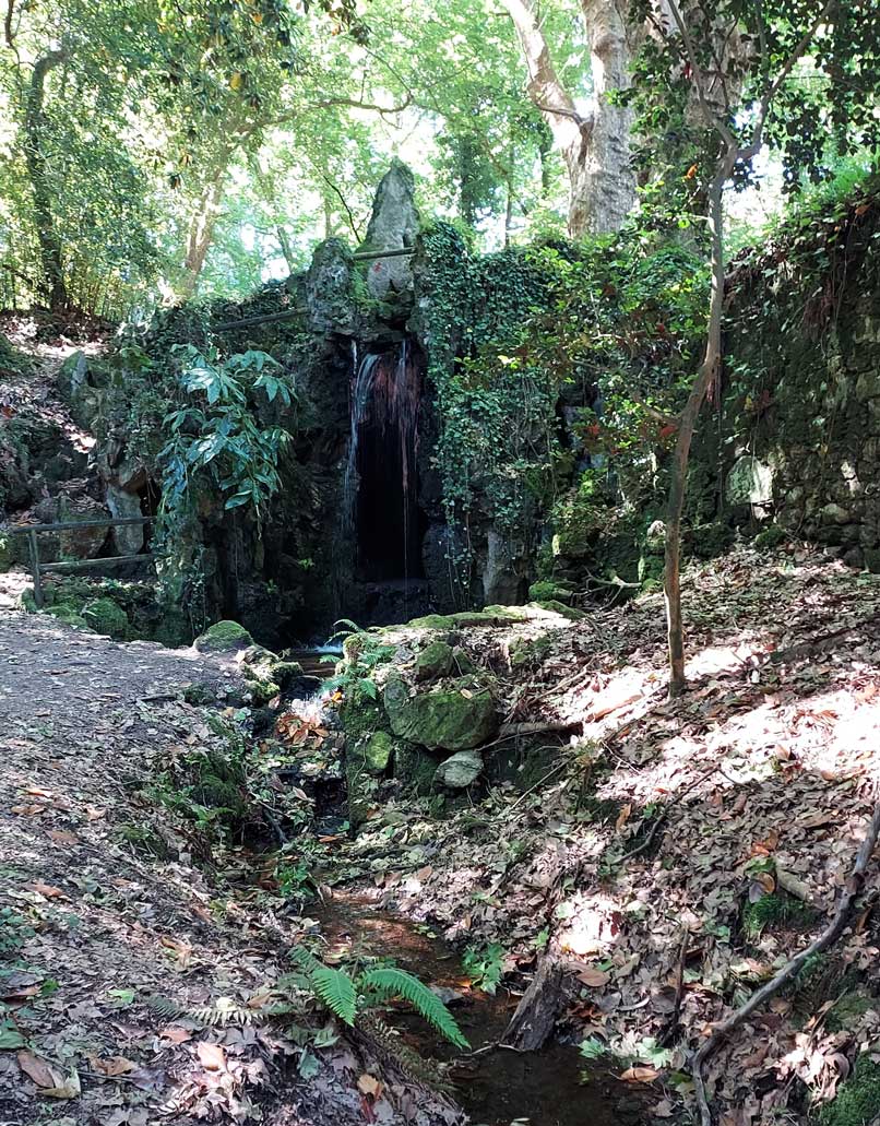 Al final del arroyo, descubrimos una pequeña gruta y una fervenza (cascada) que marcan el inicio del curso de agua. Son elementos que recuerdan mucho los jardines de Indianos, propios de la época.