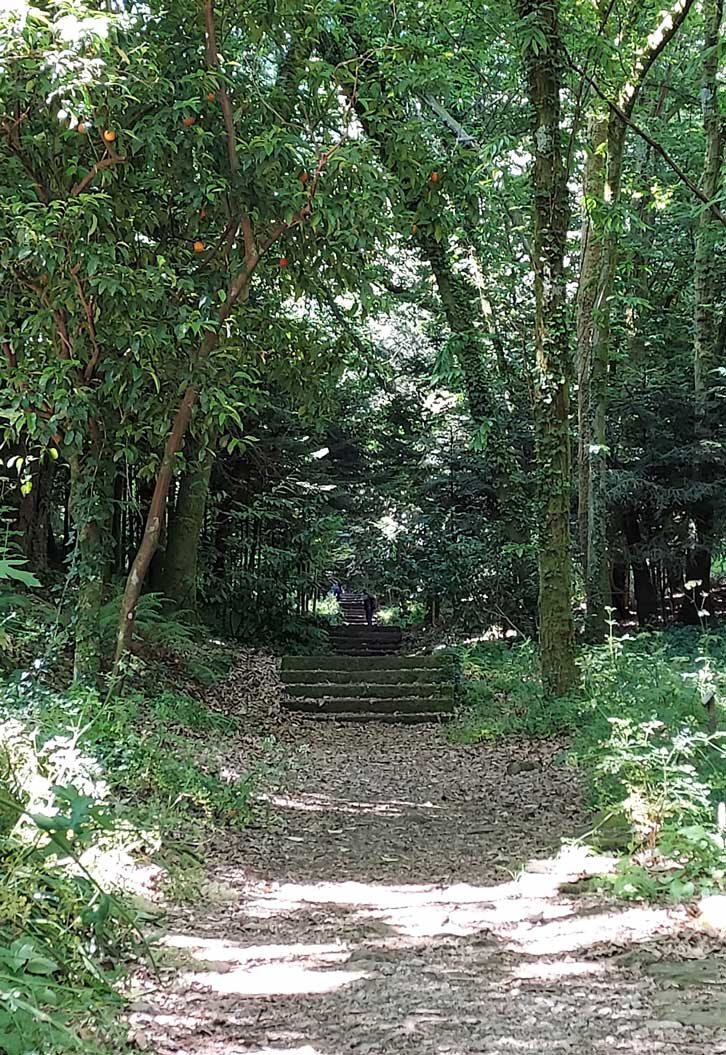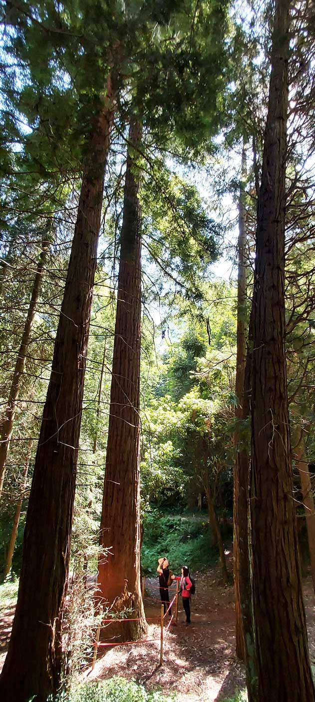 En todo momento, transitamos bajo un espeso dosel arbóreo formado por grandes eucaliptus, castaños, carballos y, especialmente, unas enormes secuoyas rojas que miden más de 40 metros.