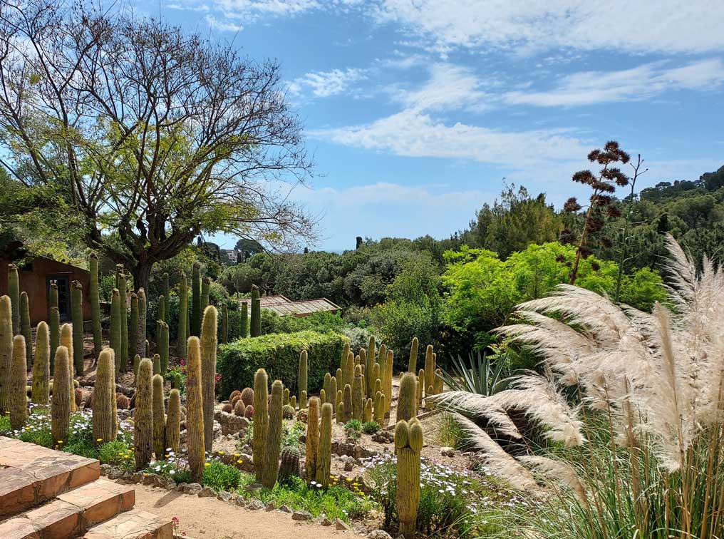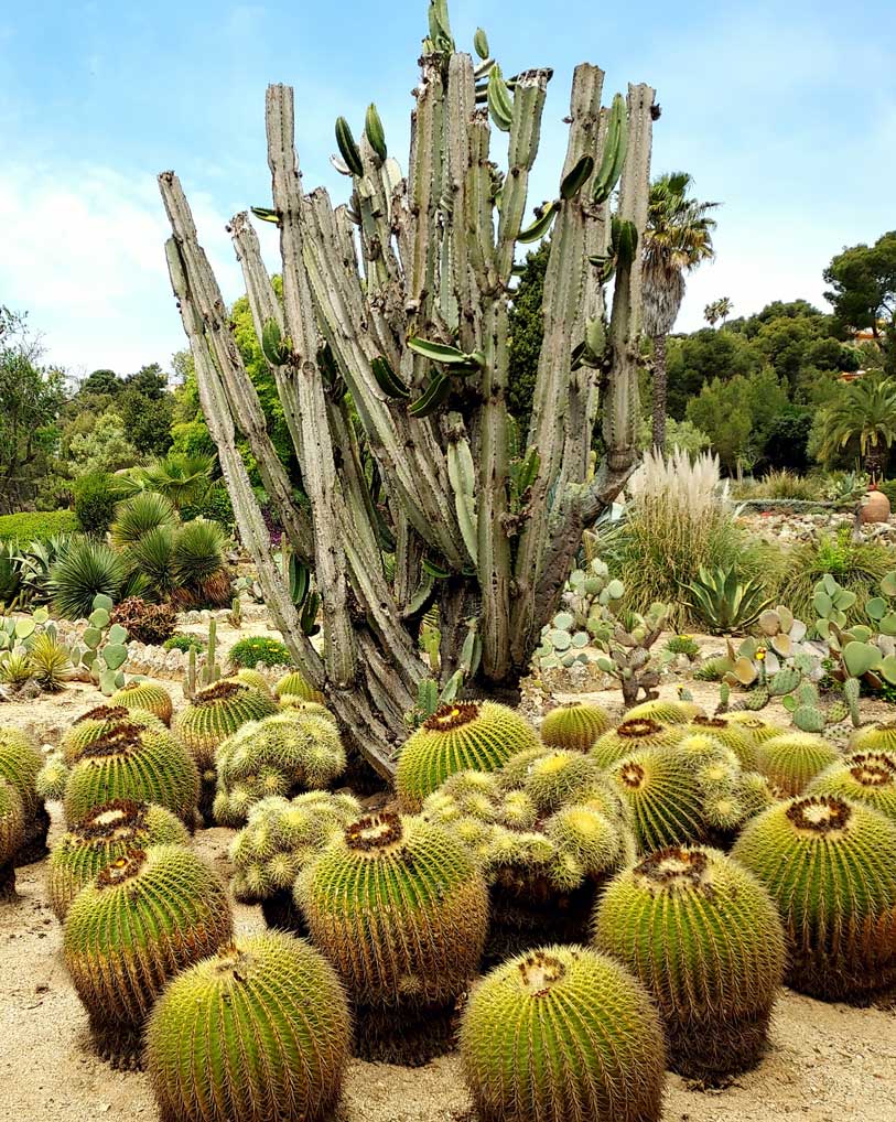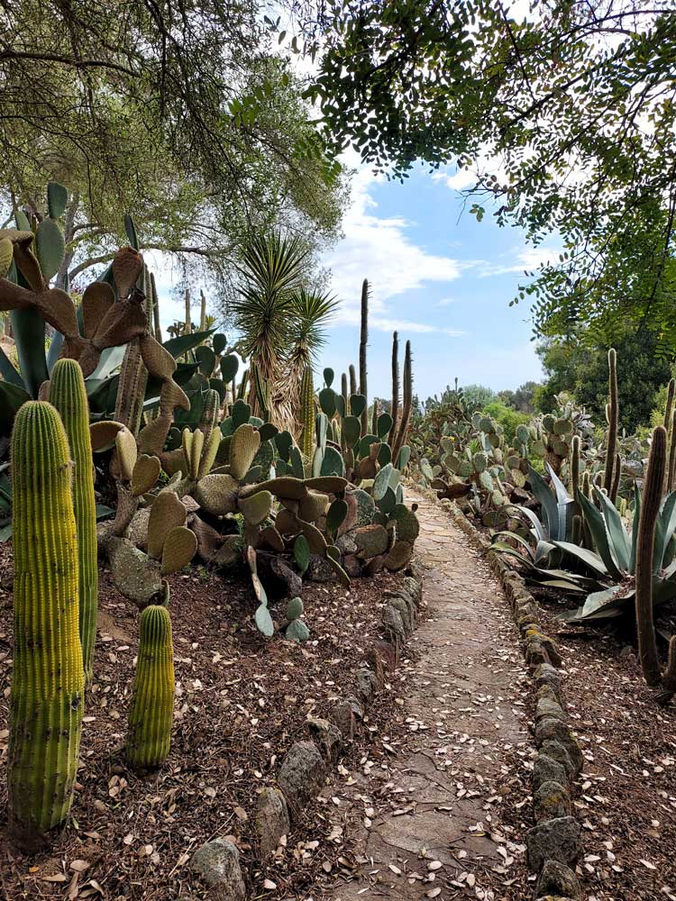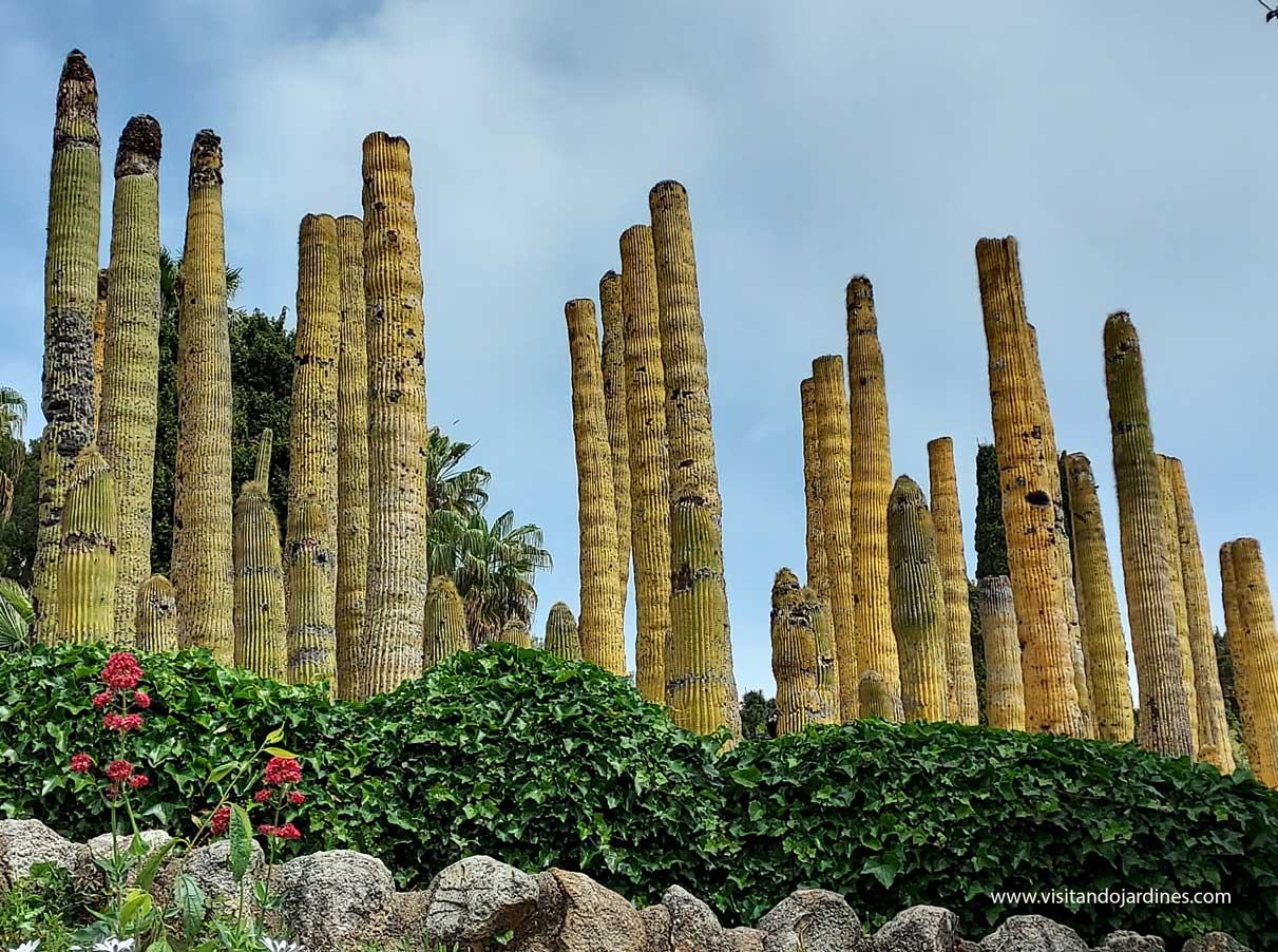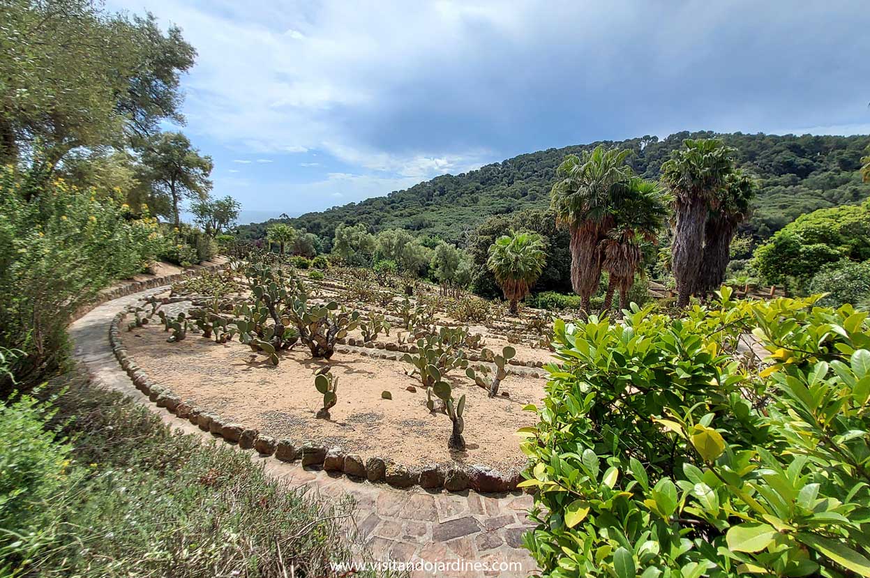 En el jardín, se mezclan cactus de distintas formas y tamaños. Grupos de ejemplares columnares, que llegan a medir varios metros, se combinan con las especies globulares y cladodios que aparecen formando imágenes de gran belleza.