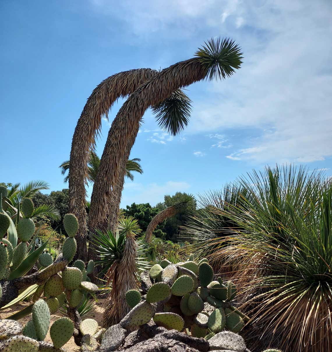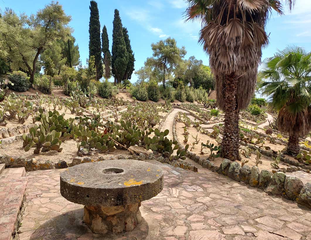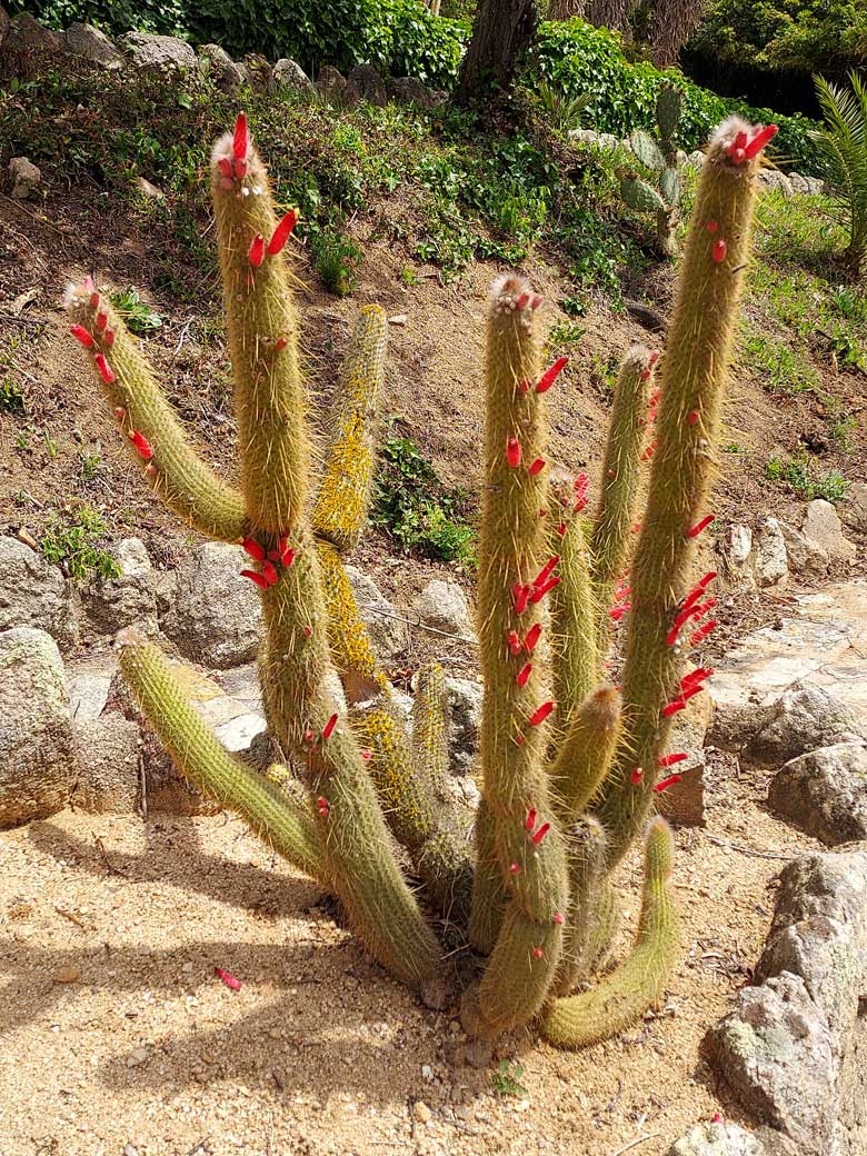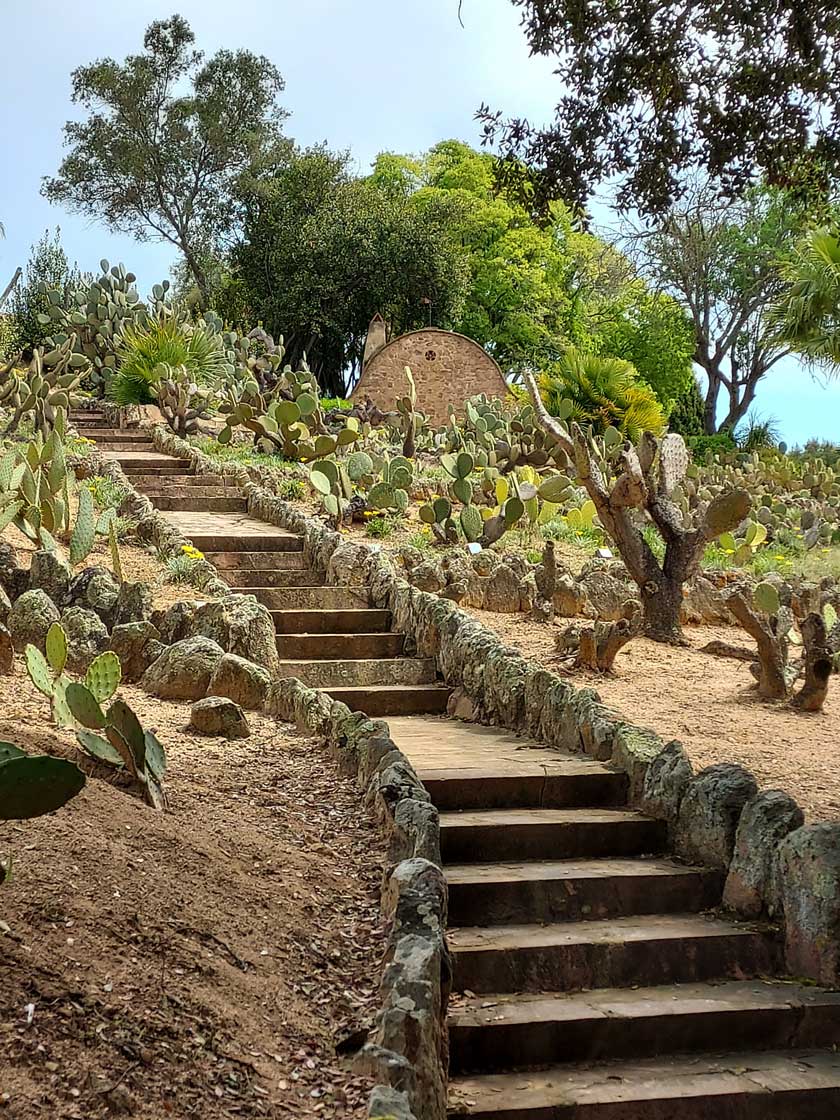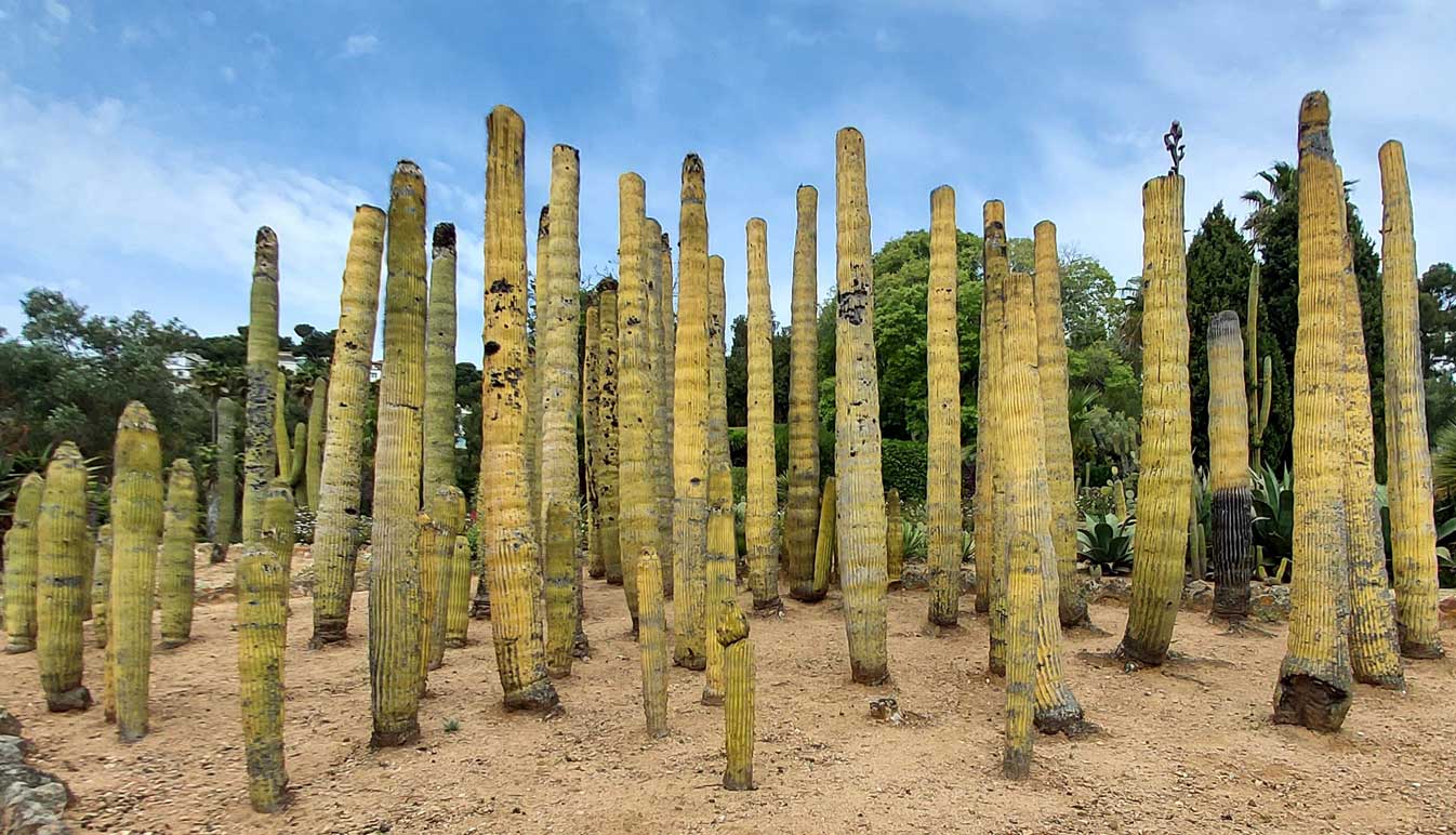 En el jardín, se mezclan cactus de distintas formas y tamaños. Grupos de ejemplares columnares, que llegan a medir varios metros, se combinan con las especies globulares y cladodios que aparecen formando imágenes de gran belleza.