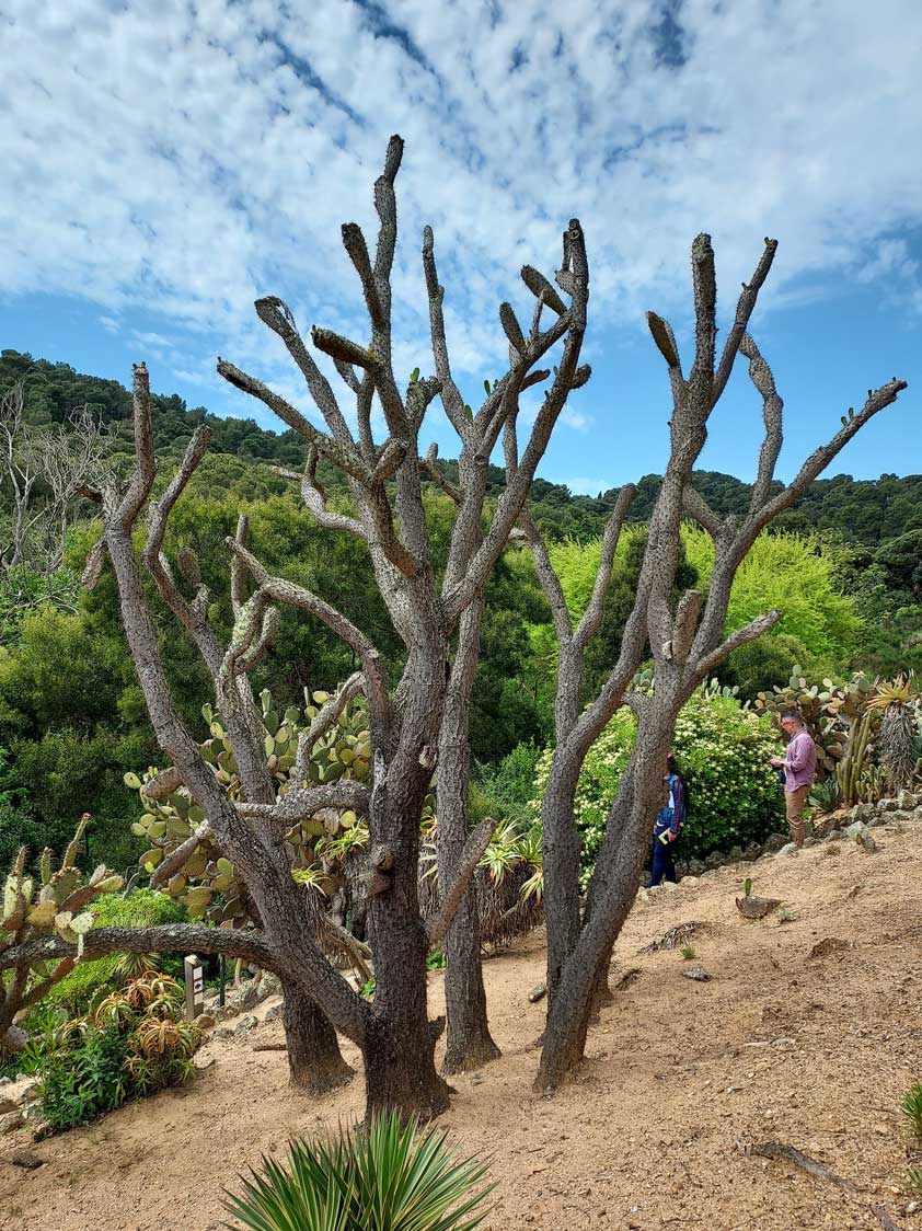 Por sus dimensiones, resulta especialmente destacable un grupo de Neobuxbaumia polylopha, un cactus arborescente originario de México, cuyas poblaciones naturales están en peligro de desaparición y que en Pinya de Rosa, han encontrado un hábitat ideal.
