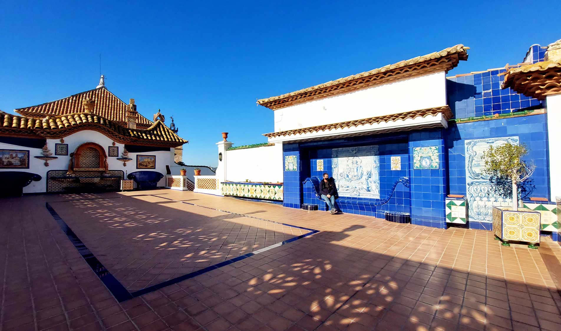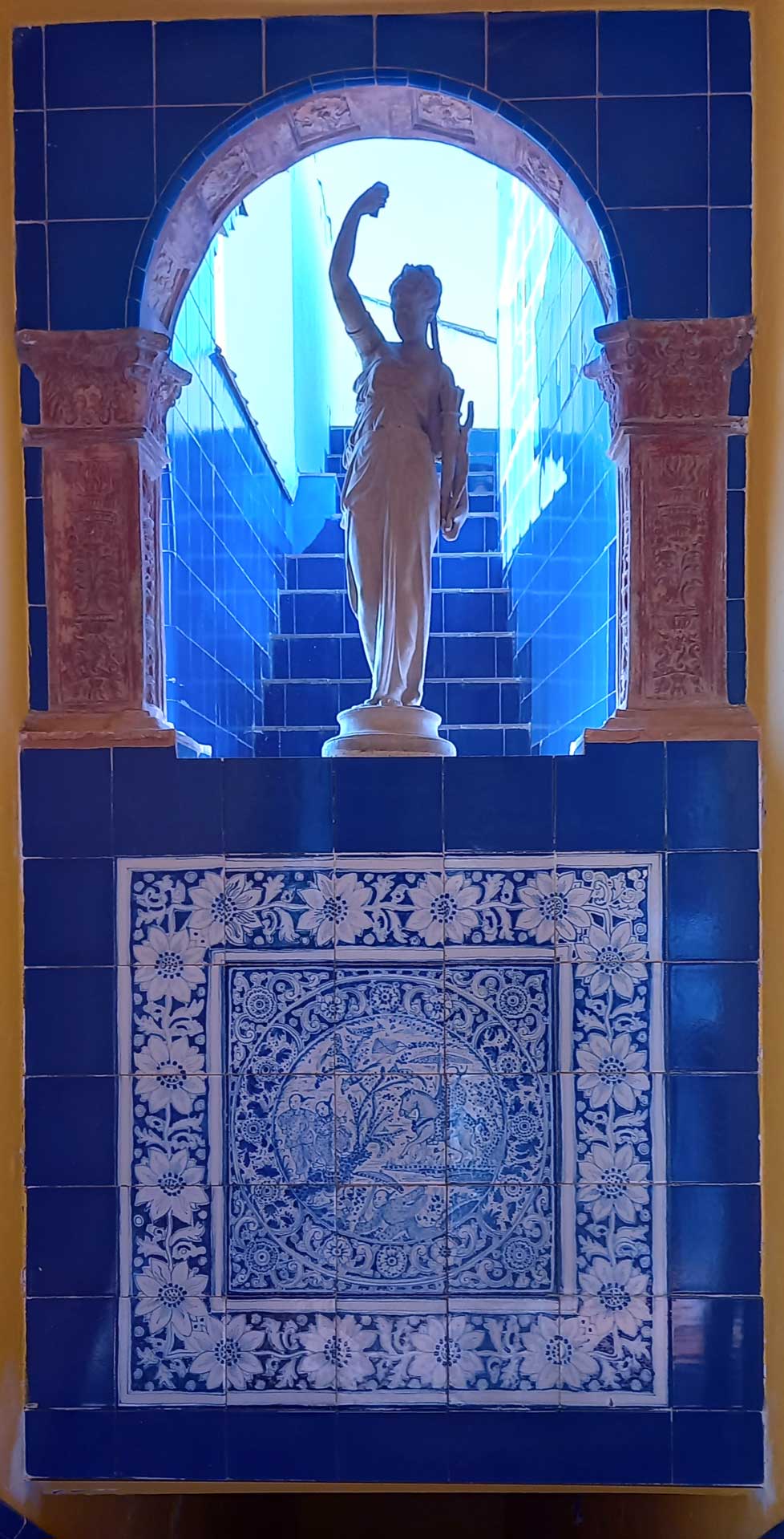 Está totalmente cubierta por azulejos decorados a mano con técnicas hispano-moriscas, como la cuerda seca y esmaltes pintados, cocidos en hornos de leña.