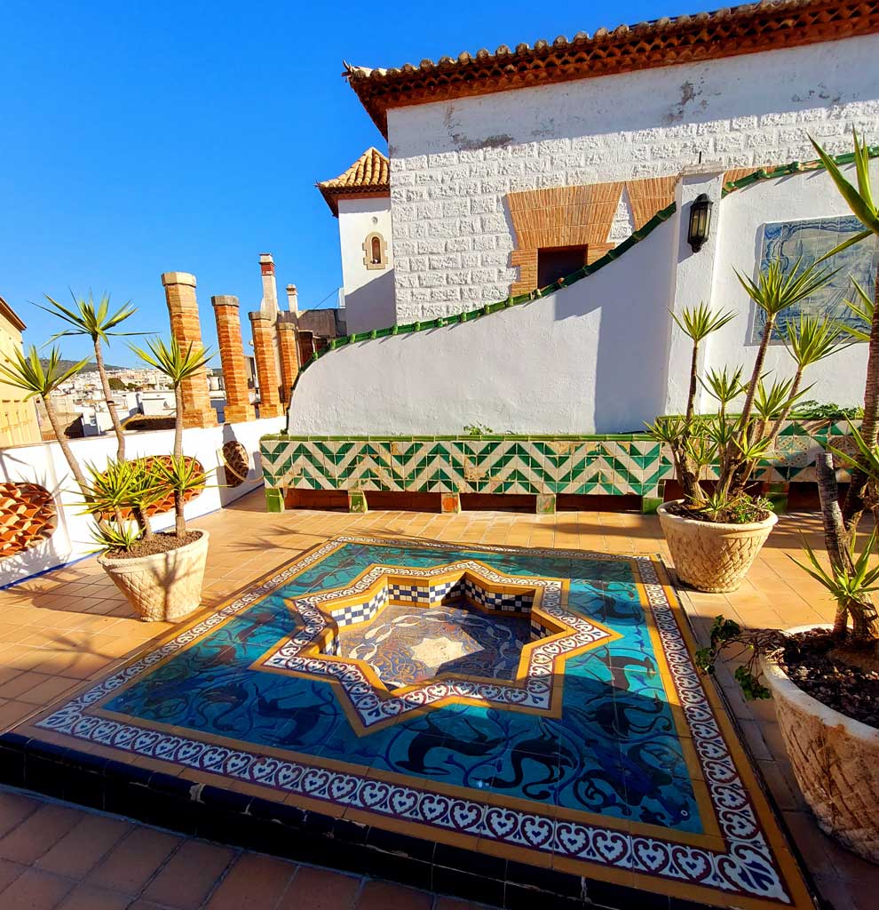 Actualmente, la terraza restaurada ya no dispone de este elemento de agua, pero conserva su encanto decorada con bellos azulejos, picas y bancos ondulados recubiertos por cerámica azul, además de unos óculos con originales celosias.