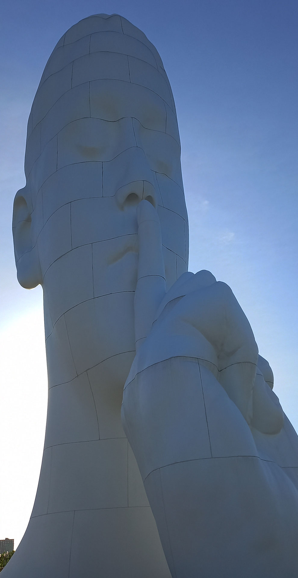 Esta nueva figura, que forma parte de la serie de caras alargadas de Plensa, viene acompañada de una mano con el dedo índice cruzando los labios, pidiendo silencio.