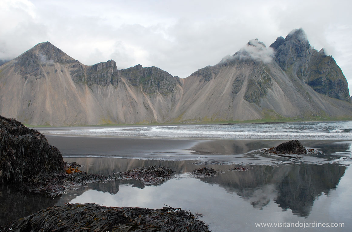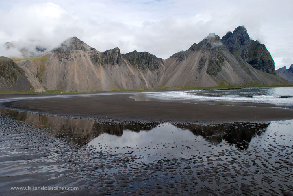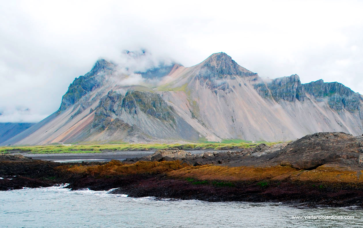 La península de Stokksness, cerca de la ciudad de Höfn, cuenta con una singular playa de arena negra guardada por los montes Vestrahorn, cuyas paredes verticales de casi 500 metros emergen desde la misma playa.