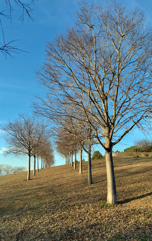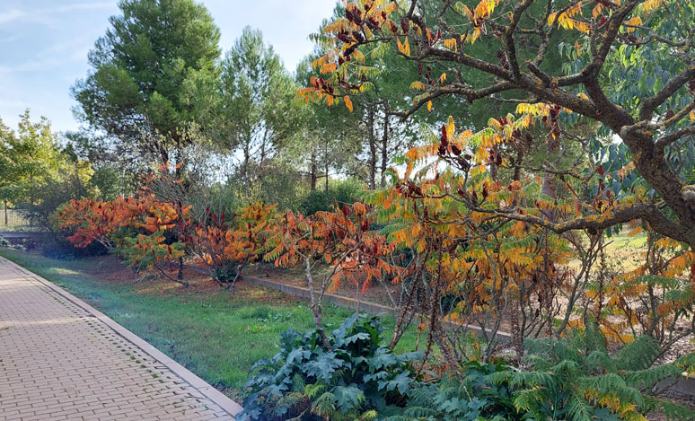 La espectacular coloración que adquieren los liquidambar y los fresnos de hoja estrecha, forma ya una de las imágenes características y más populares del Turó de Can Mates.