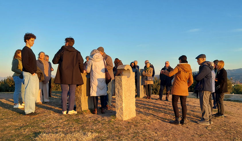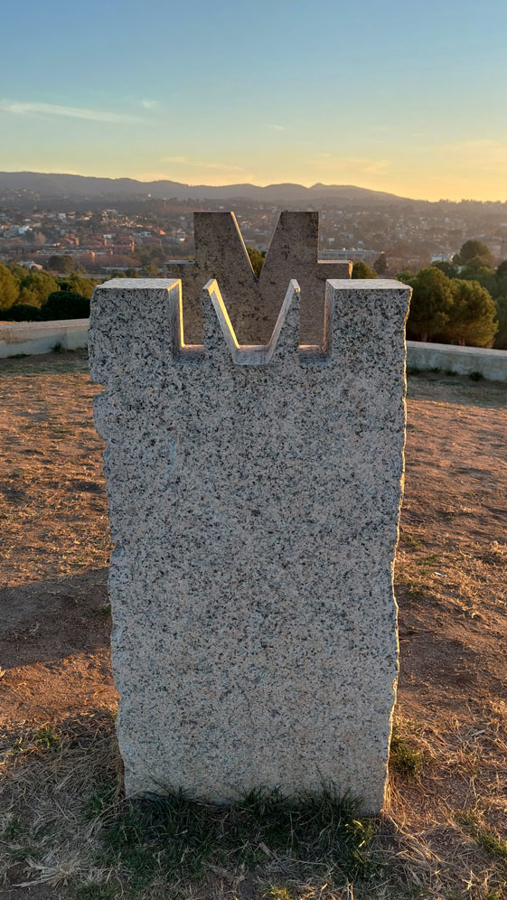 Aprovechando que se trata de un mirador abierto 360º se situaron ocho pares de monolitos de granito. Estos pares están alineados en la dirección del viento, formando las iniciales de cada uno de ellos.