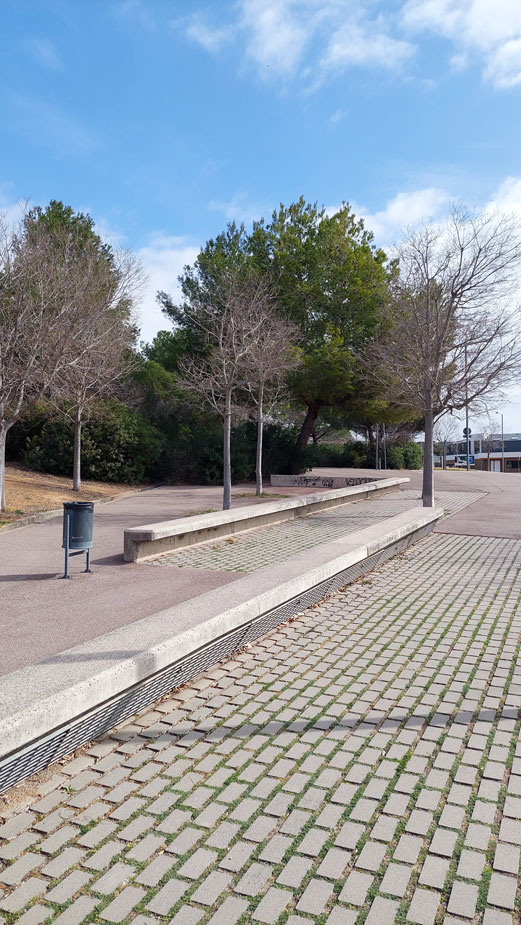 En esta zona, aparecen distintos elementos que se van repitiendo: un banco de hormigón sobre un pavimento de adoquín, pequeños muros y una iluminación característica, que van generando espacios de entrada al parque desde el vial.