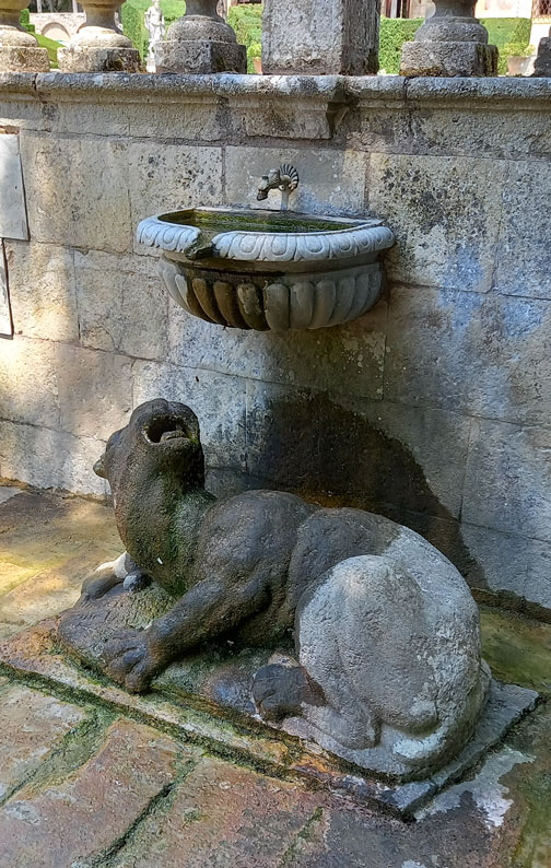 Al llegar al centro del jardín, una fuente de pila rodeada de cuatro estatuas permite descubrir una primera visión lejana de la Villa y la plaza de las revelaciones.