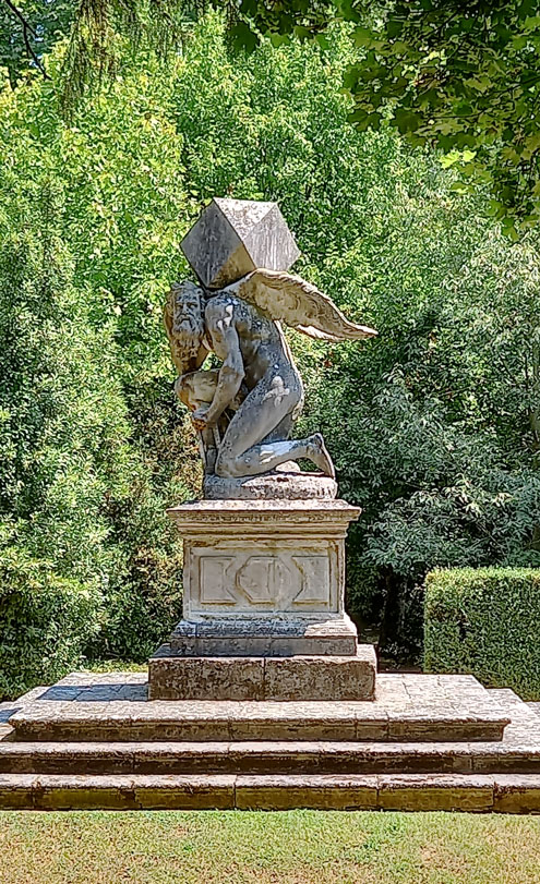 Un poco más allá, el monumento al Dios Cronos que se inclina bajo el peso de los años, simboliza el viaje del alma más allá de los límites del espacio y el tiempo.