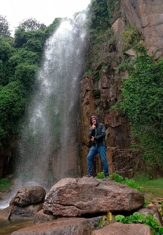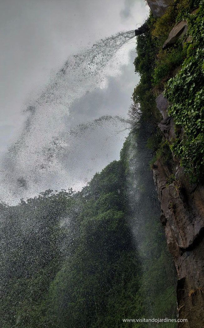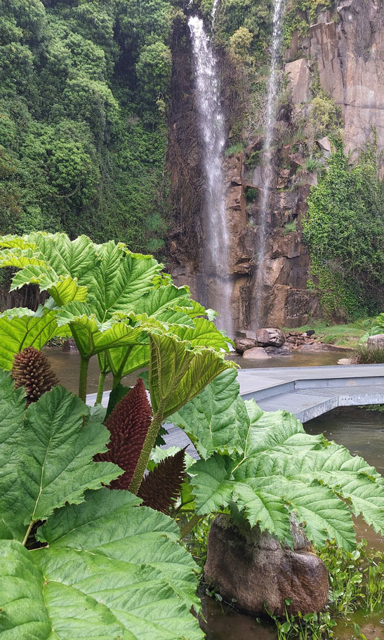 Además, la gran cascada de 25 metros de altura que se precipita al vacío desde lo alto del acantilado, genera una humedad ambiental que permite el desarrollo de plantas exóticas, como los helechos arbóreos y las gunneras.