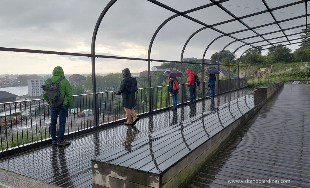 El jardín prosigue a través de una escalera por el borde del acantilado y enlaza con un sendero que recorre distintos miradores, con vistas del río y sus muelles, vestigios del pasado industrial.