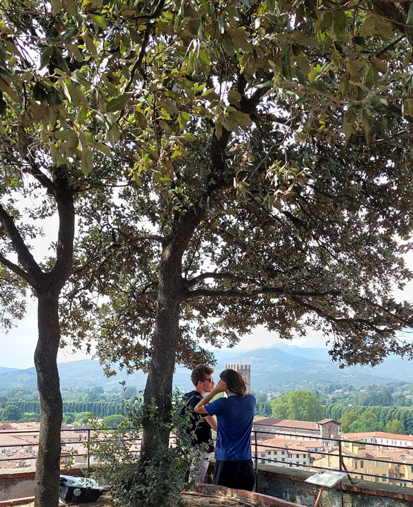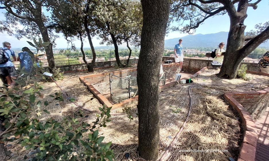 A la sombra de las encinas, se pueden admirar las plazas, callejones, campanarios y tejados y, al fondo, todo el paisaje de montañas que rodean la ciudad desde los Alpes Apuanos a los Apeninos y la cordillera del Monte Pisano.