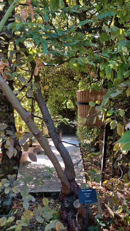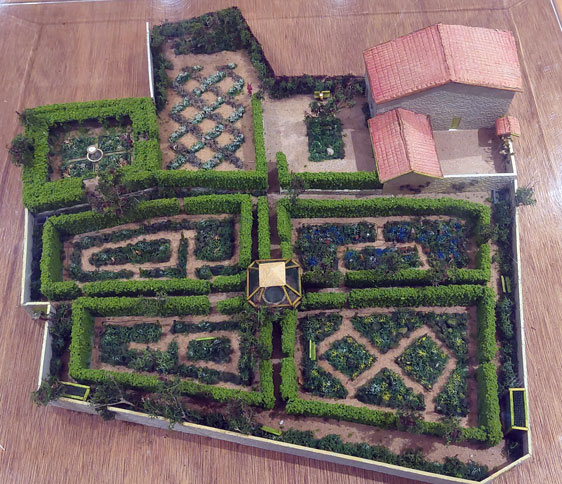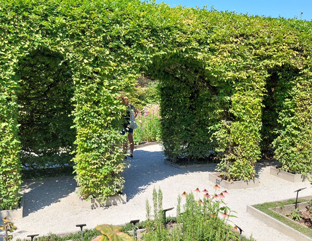 Los setos de carpes y empalizadas de frutales, forman un laberinto y delimitan cuatro pequeños jardines temáticos dedicados a los sentidos: la vista, el tacto, el gusto y el olfato.