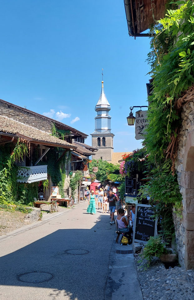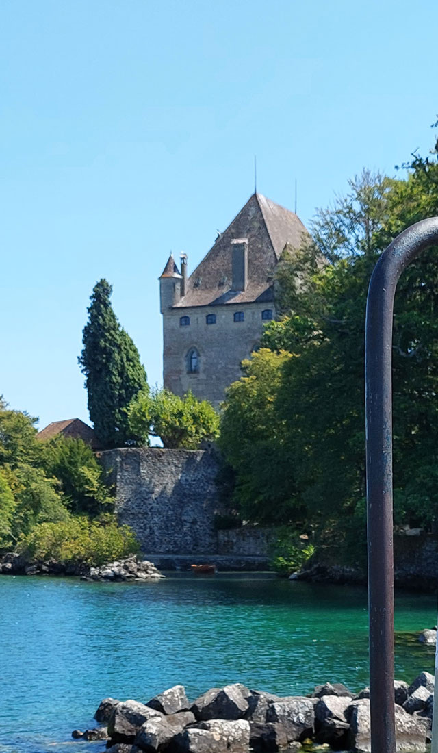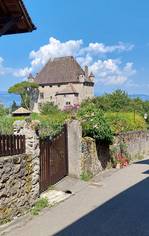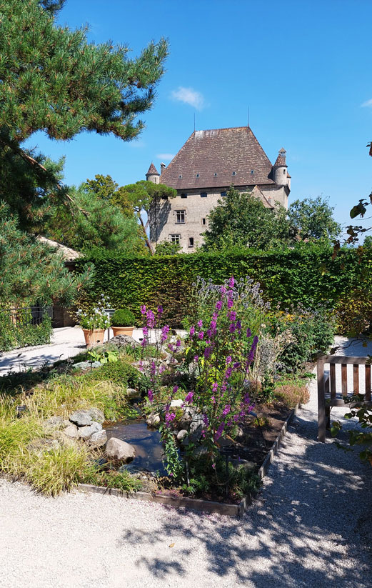 Por encima del resto de edificaciones, destaca la silueta del castillo alrededor del cual durante el siglo XIX el Barón François d’Yvoire, gran aficionado a la botánica, plantó distintos ejemplares de especies raras en la zona, que sobrevivían aquí gracias al microclima del lago.