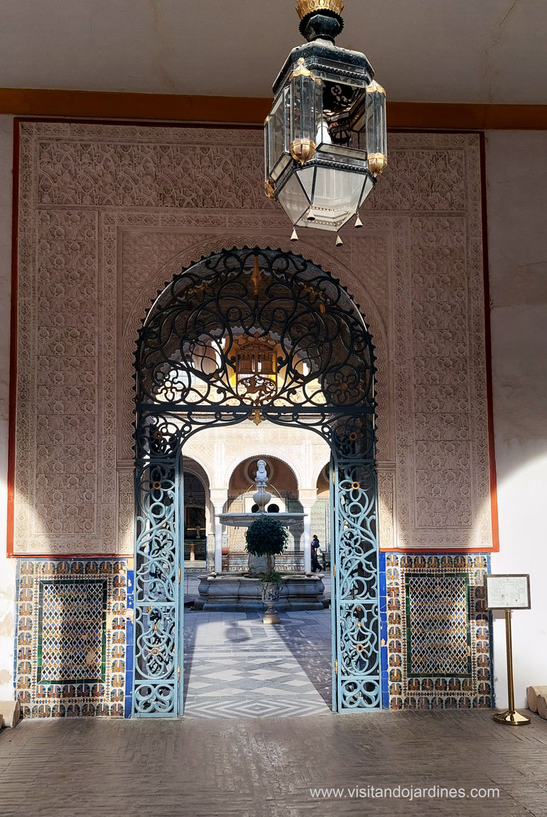 Desde aquí, una puerta bellamente decorada con mosaicos y adornos de fundición de hierro, da paso al noble edificio de dos plantas articulado en torno a un gran patio andaluz.