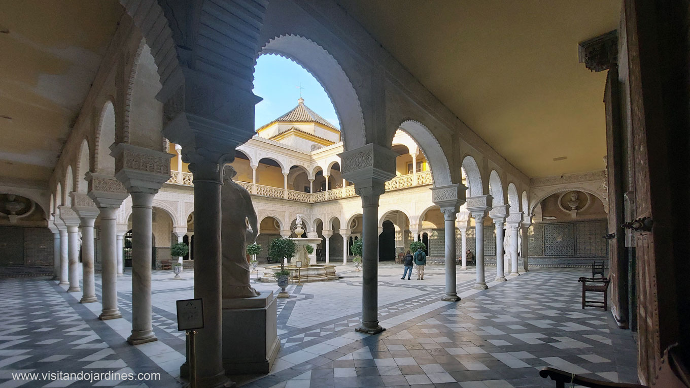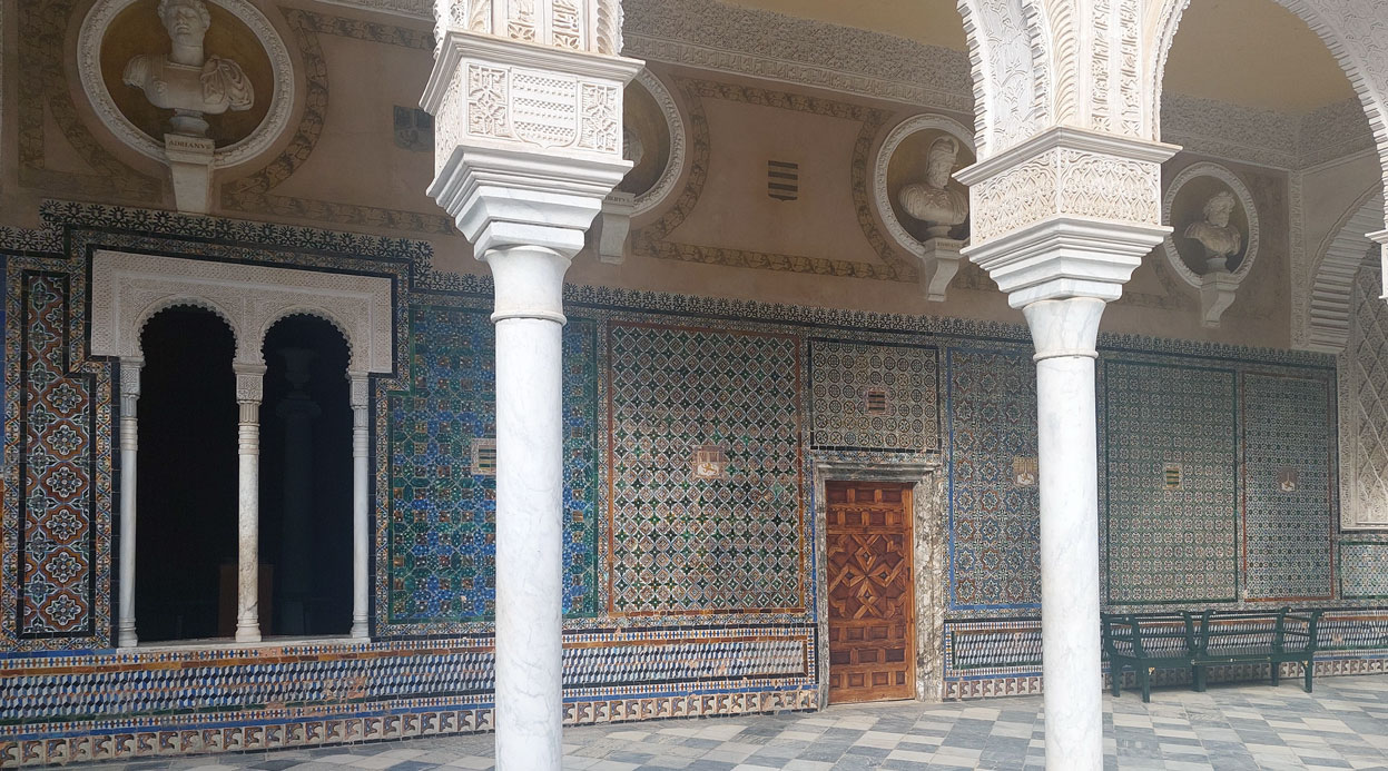 Las paredes que rodean el patio, contienen bustos de emperadores romanos y en la parte baja, un sinfín de elaborados azulejos del siglo XVI, forman una de las mayores colecciones de Andalucía, solamente comparable con los del Real Alcázar.