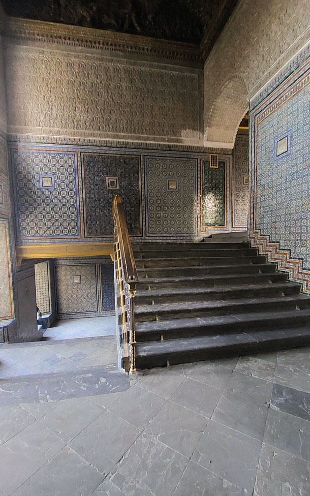 El cubrimiento ostentoso de techos y paredes, con una gran cúpula representando el firmamento y las paredes totalmente recubiertas de azulejos, simbolizan perfectamente la riqueza y el poder que atesoraban los propietarios del palacio.