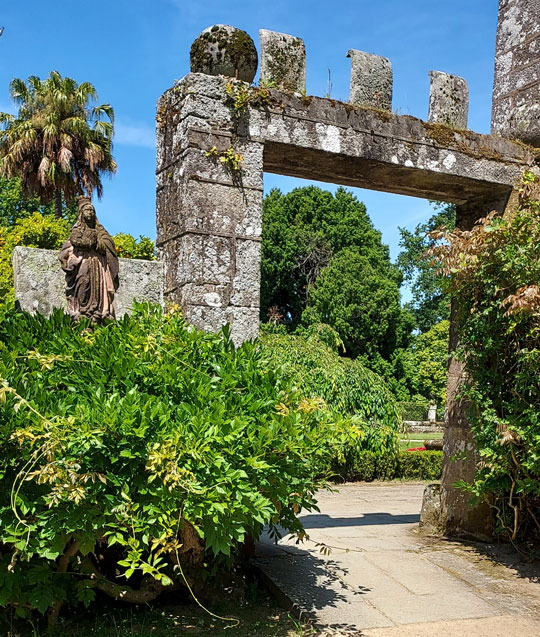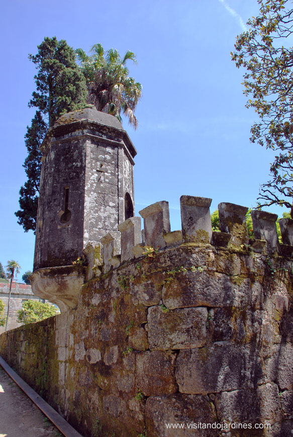 Siguiendo el recorrido de esta terraza inferior, llegamos de nuevo al jardín formal de magnolias y al muro con almenas, donde las garitas señalan el regreso al jardín de acceso al Pazo.