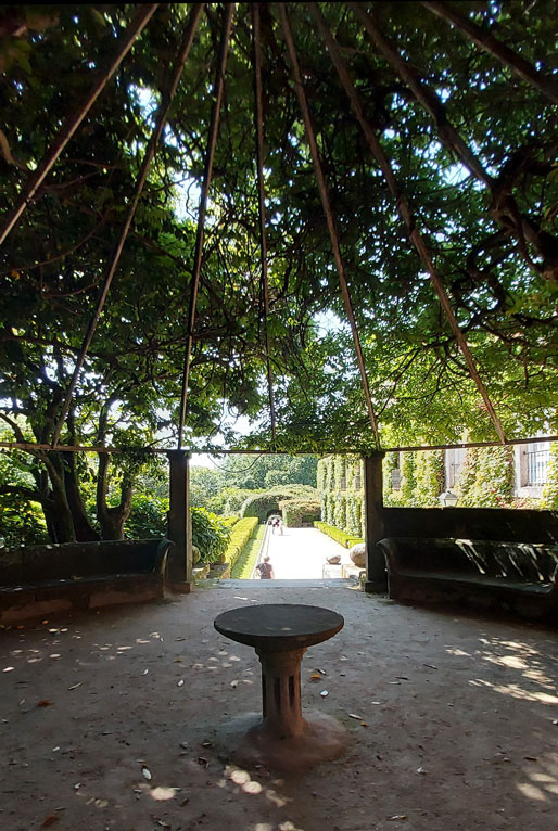 Desde la terraza superior, el Paseo de la Rosaleda nace de un cenador cubierto por una pérgola de madera —antiguo invernadero— y se extiende siguiendo un eje paralelo al del jardín francés