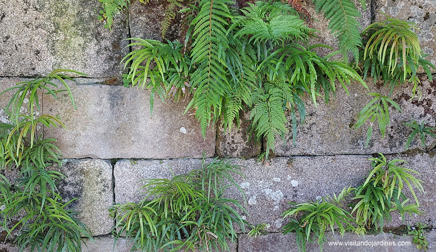 Un sólido muro de grandes bloques de granito, en las grietas del cual nacen esplendidos helechos, delimita el espacio ocupado por el jardín francés y marca el inicio de la pradera y el bosque.