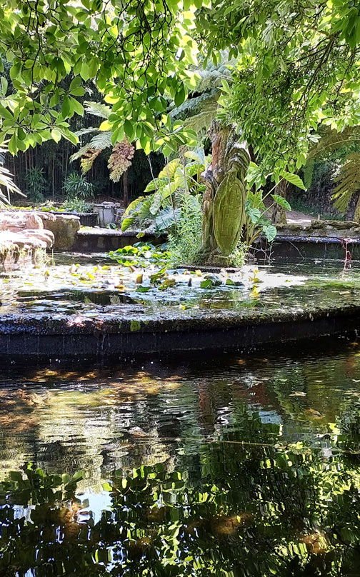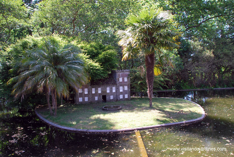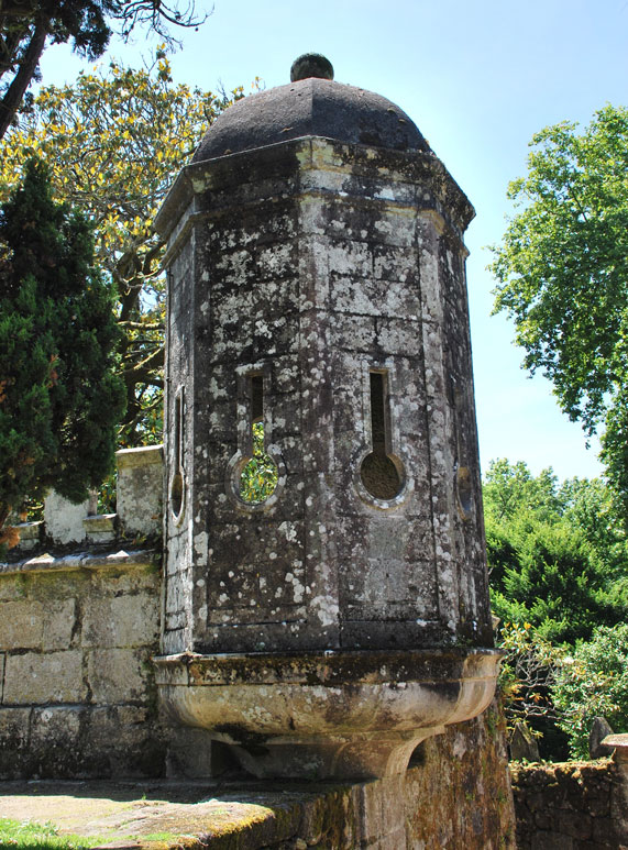 Un palomar circular (Pombal) del siglo XIX, edificado sobre unas grandes rocas y un pequeño arroyo que discurre entre grandes árboles, marcan el punto central del jardín romántico.