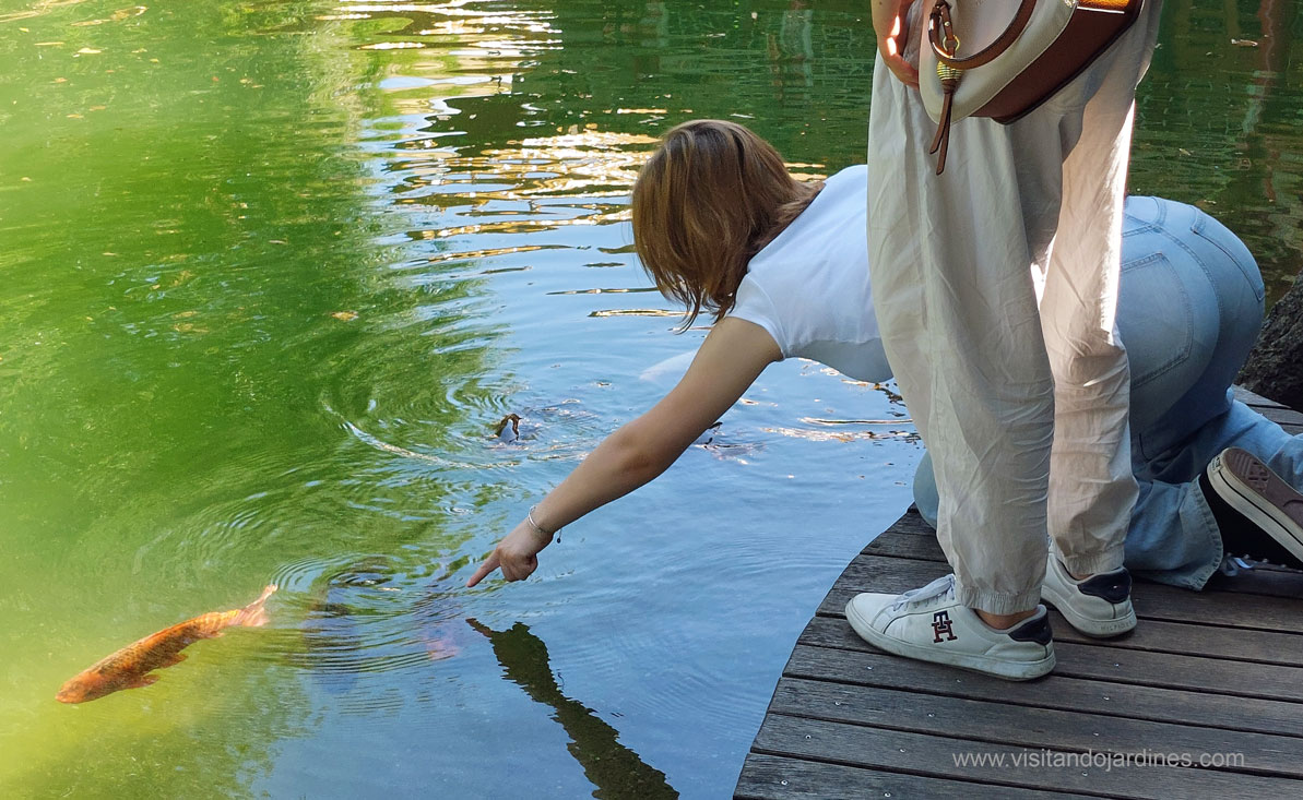 Como es tradicional en los jardines orientales, en el lago habitan vistosas carpas koi, que suelen nadar cerca de la superficie, despertando así el interés de los visitantes.
